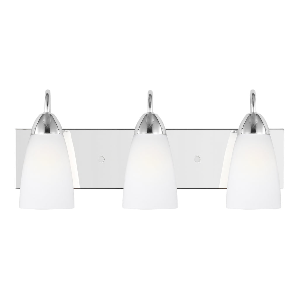 The Seville three light vanity fixture in chrome is an ENERGY STAR qualified lighting fixture that uses LED bulbs to save you both time and money. The Seville collection represents commitment to high style at a sharp price. The modernist design is epitomized by the teardrop curves in the arms tipped by Etched glass diffusors throughout the chandeliers and bath fixtures. The collection offers a "whole home" lighting solution in every imaginable category. The assortment includes nine-light, five-light, and three-light chandeliers (either with up-light or down-light), pendants in four sizes as well as one-light, two-light, three-light , four-light and five-light wall/bath fixtures. Install a stylish and elegant addition to any room in the house. Seville is offered in Brushed Nickel and Burnt Sienna finishes.