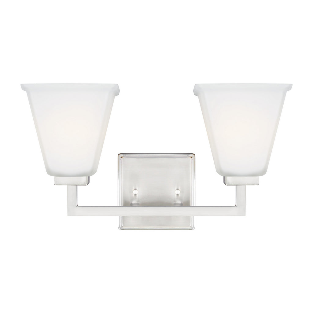 The Ellis Harper two light vanity fixture in brushed nickel is an ENERGY STAR qualified lighting fixture that uses LED bulbs to save you both time and money. Ellis Harper has an Arts and Crafts pedigree with a Modernist twist. The array of fixtures showcases the commitment to high style with robust construction and craftsmanship at an exceptional price. The subtle detail allows this transitional design to easily fit into any decor. The sleek, geometric arms and square Satin Etched glass shades add touches of elegance to its streamlined profile. The assortment includes: four- and eight-light chandeliers, a six-light linear, one-light mini-pendant, and one-, two-, three- and four-light bath fixtures. All fixtures are offered in either a Brushed Nickel or Brushed Oil Rubbed Bronze.