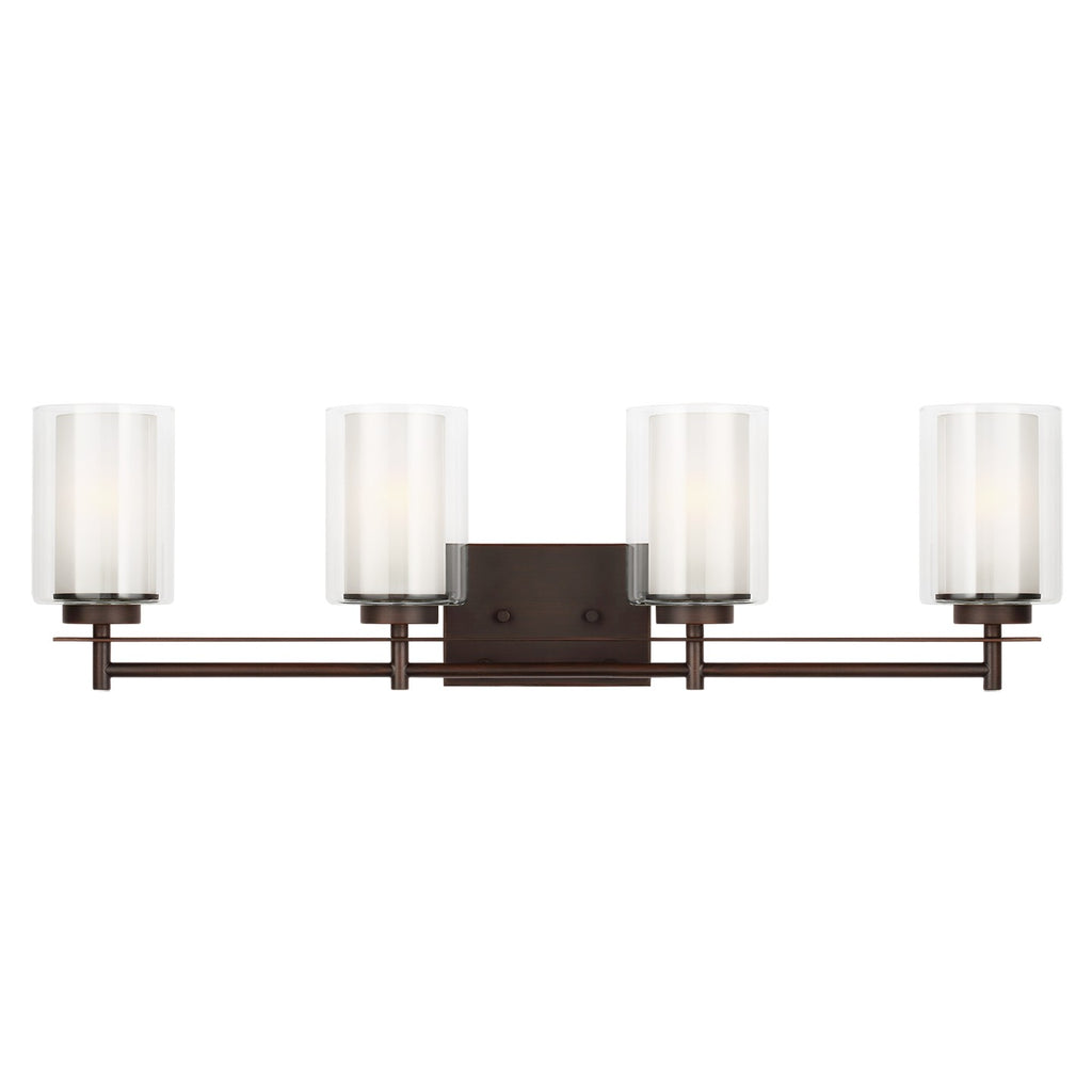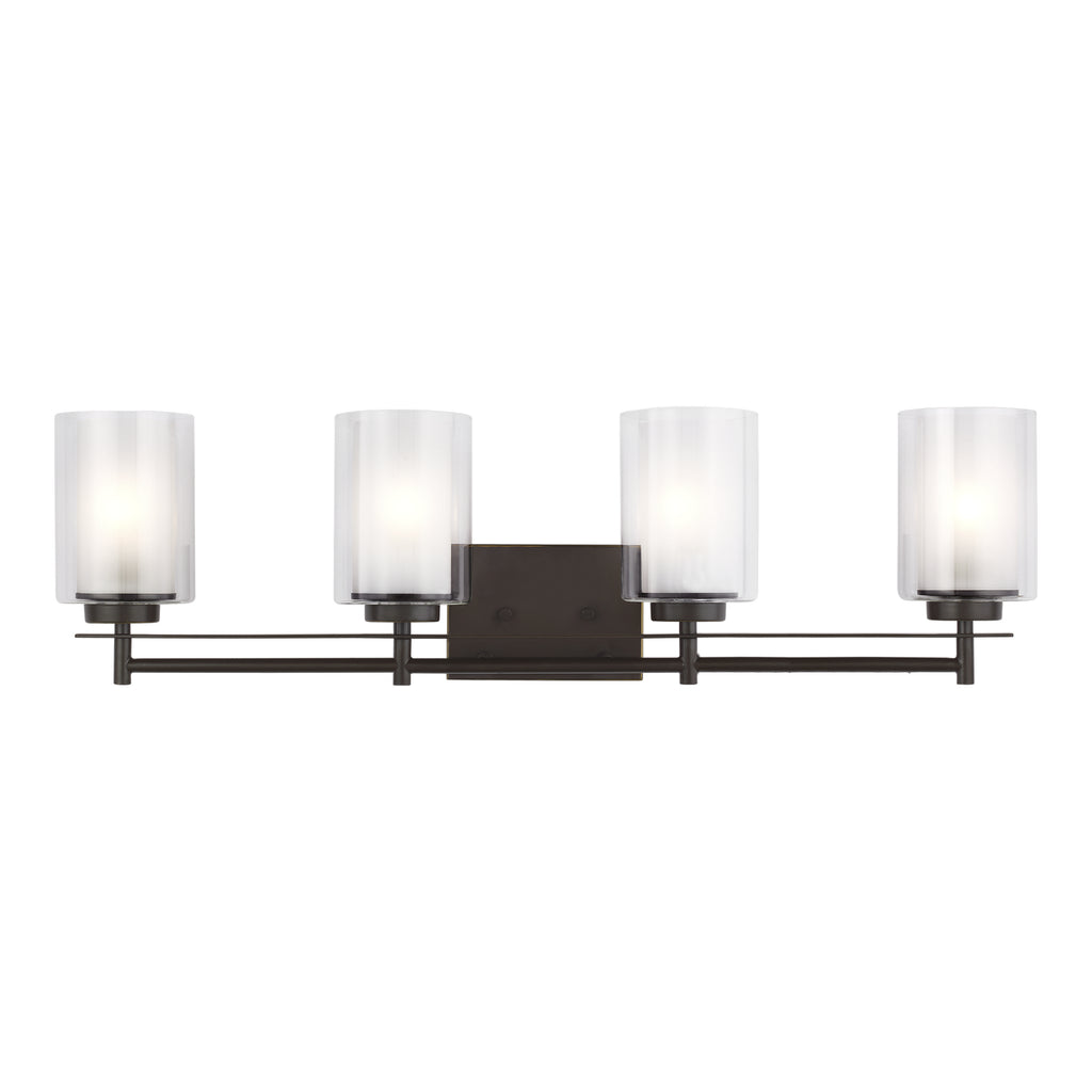The Elmwood Park four light vanity fixture in bronze offers shadow-free lighting in your powder room, spa, or master bath room. Elmwood Park by has clear glass tube shades with an inner white glass element that softens the light and helps cast an even glow. A cylinder of etched glass is centered within a larger cylinder of clear glass which encircles each light bulb to create this stunning visual effect. The full assortment includes three-, five-and nine-light chandeliers, a four-light linear, one-light mini pendant, a three-light pendant, a two-light semi flush which is convertible into a pendant, and one-, two-, three- and four-light bath fixtures. All fixtures offered in either a Brushed Nickel or Brushed Oil Rubbed Bronze. Incandescent and ENERGY STAR-qualified LED lamping are available, all fixtures are California Title 24 compliant.