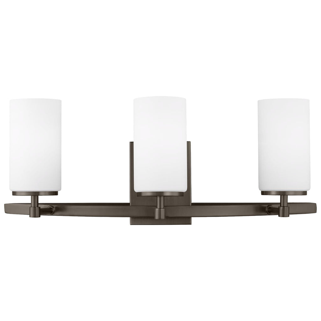 The Alturas three light vanity fixture in brushed oil rubbed bronze offers shadow-free lighting in your powder room, spa, or master bath room. The silhouette of the modern Alturas lighting collection by features an interlocking, spherical steel frame, which harkens back to the Unisphere constructed for the 1964 New York World's Fair. The minimalist Alturas Collection draws the eye to the soft, warm glow of the light emitted from the cylindrical Satin Etched glass shades. The full assortment includes three-, five- and nine-light chandeliers, a one-light mini pendant, a three-light pendant, a two-light semi flush which is convertible into a pendant, and one-, two-, three- and four-light bath fixtures. All fixtures are offered in Brushed Oil Rubbed Bronze, Brushed Nickel and Satin Bronze finishes, the bath fixtures are also offered in Chrome finish. Incandescent and ENERGY STAR-qualified LED lamping are available, all fixtures are California Title 24 compliant.