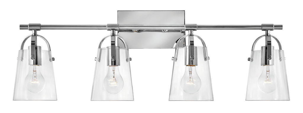 Clean and airy, Foster breathes composed simplicity into any bath space. Softly tapered clear glass, suspended from an arched handle, adds pizzazz to its transitional shape.