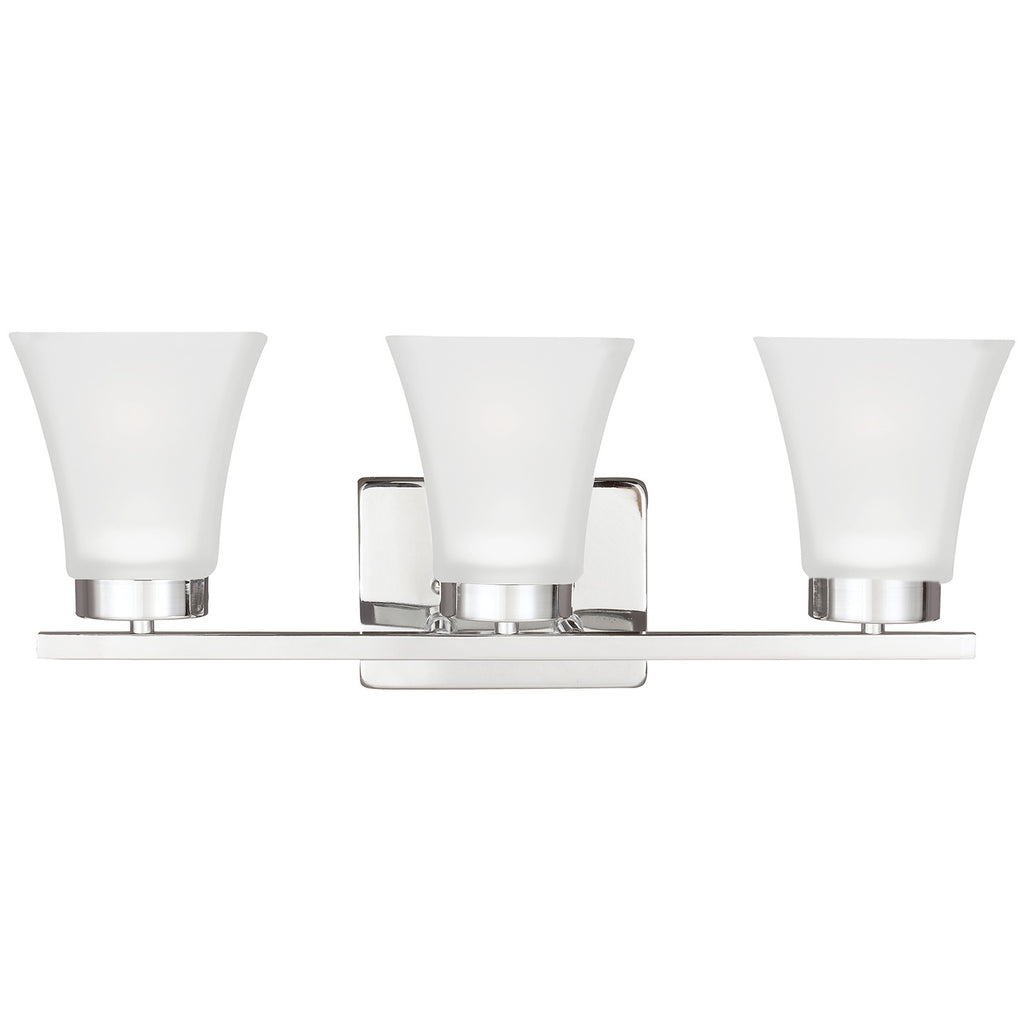 The Bayfield three light vanity fixture in chrome offers shadow-free lighting in your powder room, spa, or master bath room. The Bayfield bath collection by delivers simplicity with flair. The transitional design is a subtle combination of clean lines and flared, angular Satin Etched glass shades to bring style and warmth to the bathroom no matter the budget. Offered in Chrome, Burnt Sienna and Brushed Nickel finishes, the bath lighting collection offers one-light, two-light, three-light and four-light vanity fixtures. Both incandescent lamping and ENERGY STAR-qualified LED lamping are available, all fixtures are California Title 24 compliant.