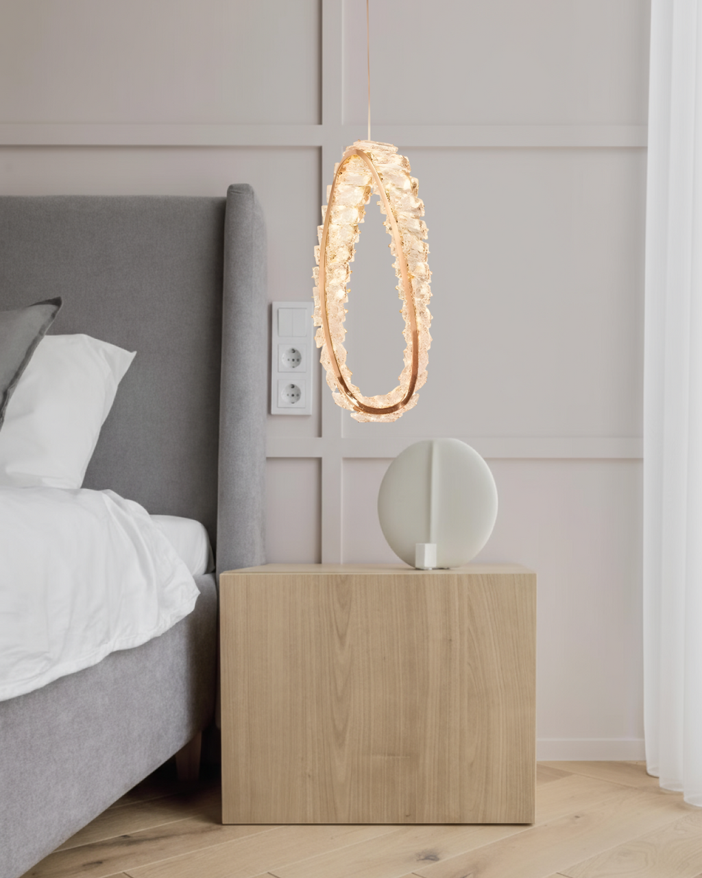LÁMPARA DE CRISTAL K9 DE TECHO LED 15W, TONALIDAD 3000K, 100-240V, 50-60HZ, GRADO DE PROTECCION IP20, DIMENSIONES: D-13CM H-32+150CM, ACABADO DORADO + MATERIAL METAL + CRISTAL, MARCA HOME DELIGHT.