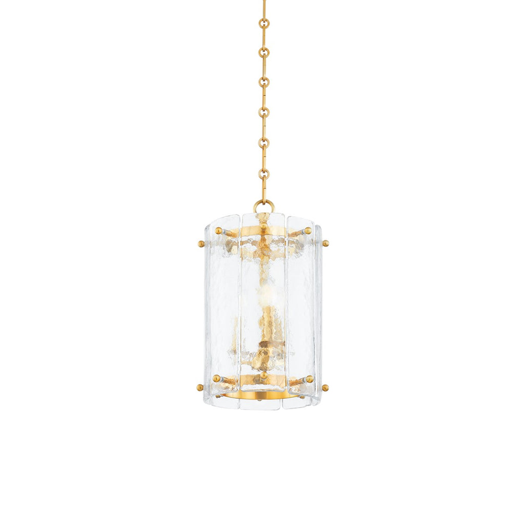 With hand-blown Piastra glass, this statement pendant reimagines a traditional lantern as an aquatic vision. Resembling water, the ripped glass silhouette diffuses and reflects the light coming from within. Vintage Brass pins and chains suspend the fixture, bringing a sense of the old world to the contemporary materiality. Available in three sizes as a lantern or as a flush mount.