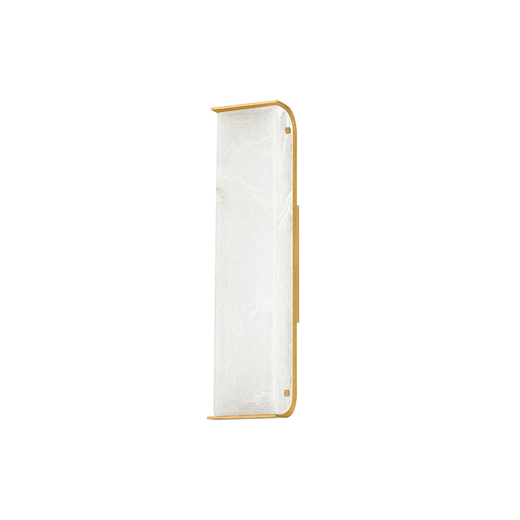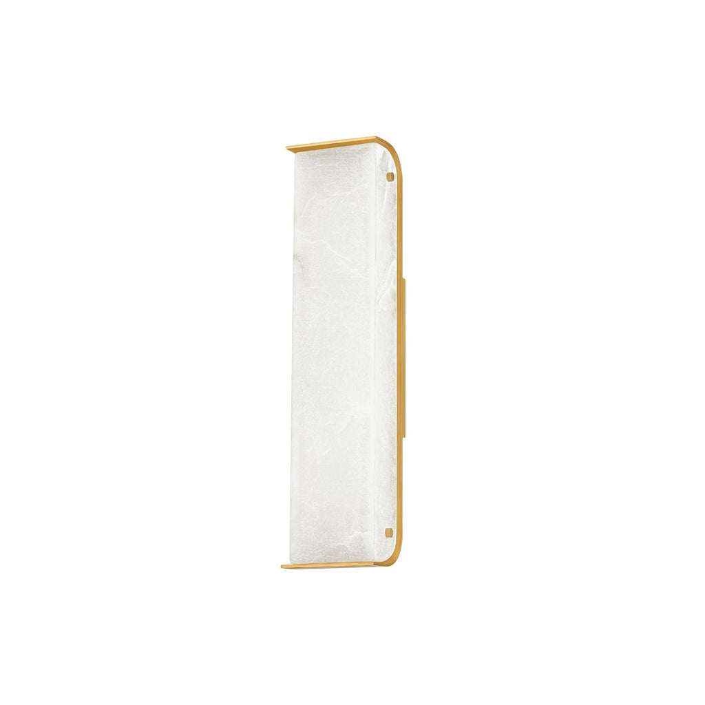 Inspired by the grandeur Greek architecture, this statuesque wall sconce features a thick alabaster stone slab ensconced within a Vintage Brass frame. With its natural veining and translucency, the ivory alabaster reveals its color and texture when lit. Available in two sizes, Hera presents a striking visual display in a hallway or bathroom.