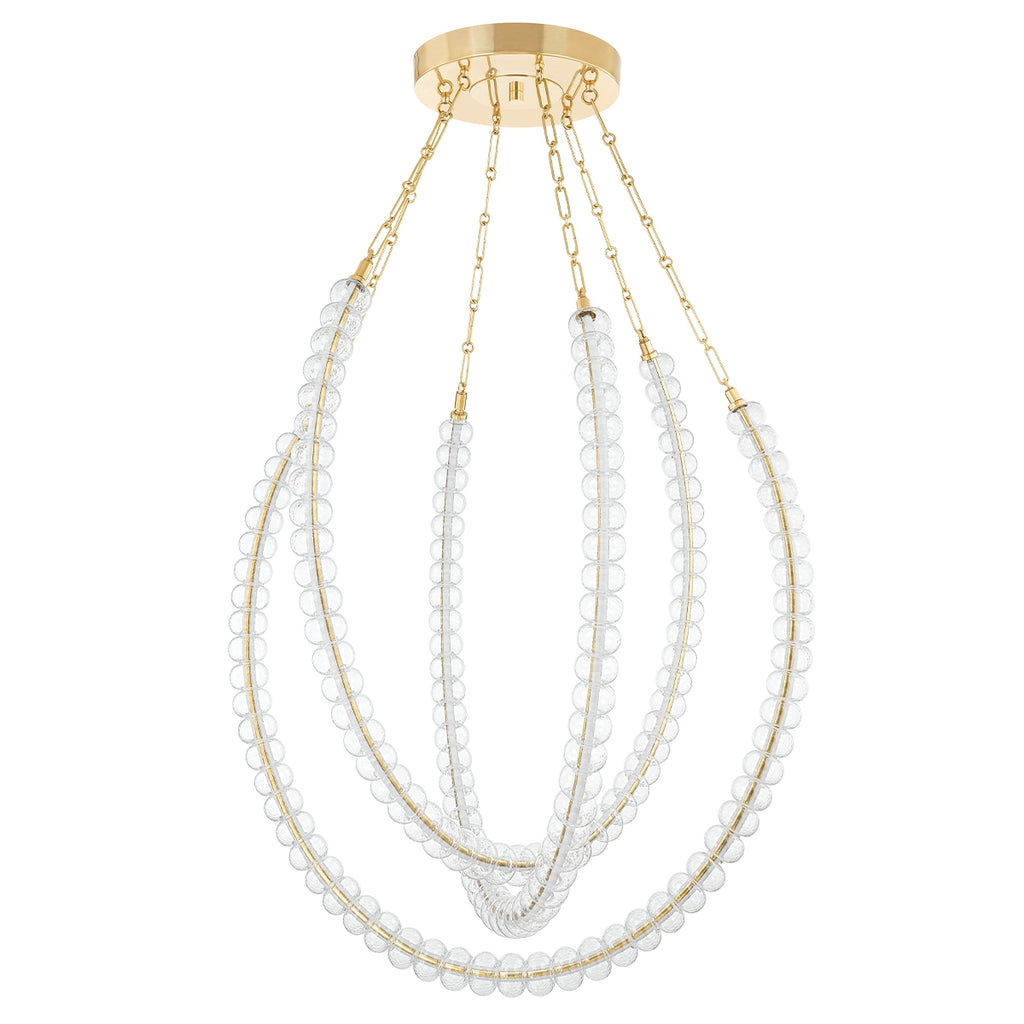 Add instant drama overhead with this show-stopping, jewelry-inspired chandelier. Clear cast glass beads are strung through swooping LED tubes with a Vintage Brass finish. Three of the beaded tubes are then strung around each other and hung from the canopy. The result is a gorgeous, airy teardrop silhouette that puts on a dazzling display when lit.