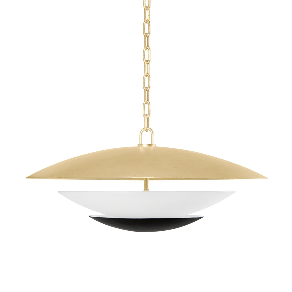 Adara mixes metal and glass to create a layered look. Light reflects softly off the Vintage Gold Leaf and Soft Black details to highlight this large-scale pendant's smooth and simple silhouette.