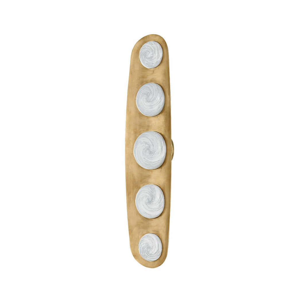 Originally inspired by 'superflush' jewelry settings, where a stone is set into densely cast metalwork, Bezel is bold and glamorous with a sleek, decorative design. The Luna glass shades, etched on the inside, allow the LED light to radiate through, creating an enchanting glow. A Vintage Brass finish adds an extra layer of elegance to this captivating fixture. Bezel is available as a 3 or 5-light sconce. Part of our Noz Nozawa collection.