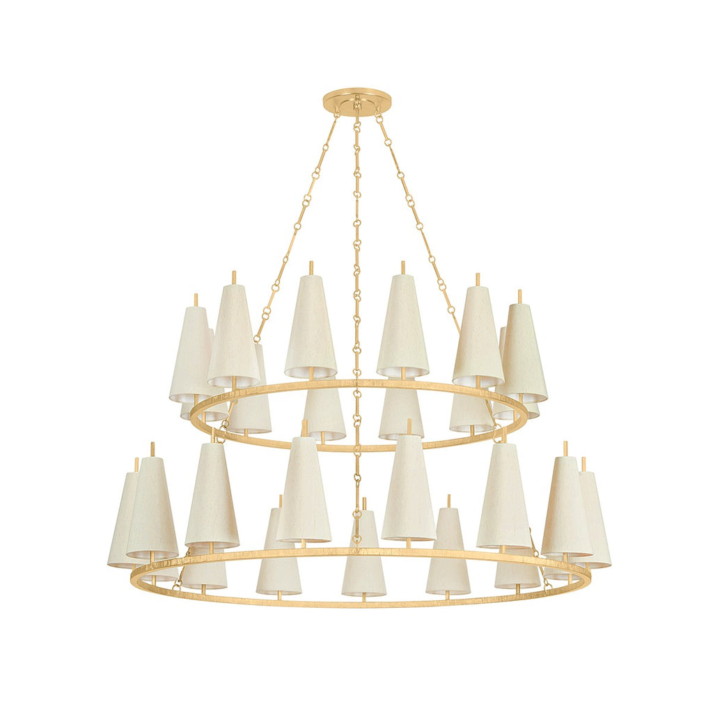 While simplistic, the natural silk shades and circular motifs of the Tirana family nod to a nautical spirit. The conical shades provide a contemporary lightness to the traditional silhouettes. By contrast, the delicately textured Vintage Gold Leaf metalwork catches the light like a modish bangle bracelet. Available as a 1-light sconce and a 12-light, 15-light, and 27-light chandelier, Tirana produces warm, refined lighting for transitional spaces.