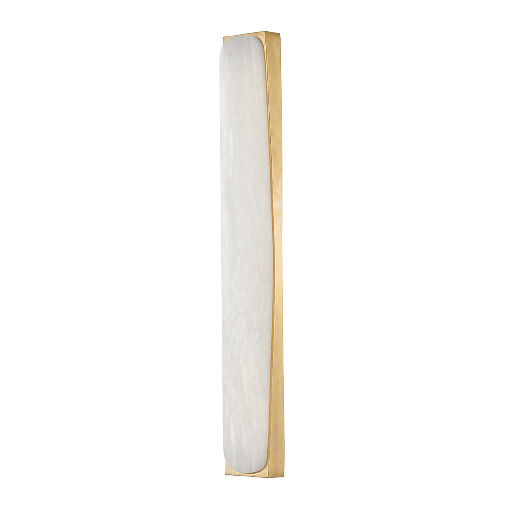 Thoroughly modern, Millie is clean and simple. A luxurious piece of Spanish alabaster is set within a subtlety waxing and waning frame of vintage brass or burnished nickel. While the alabaster is gorgeous unlit, it comes to life when lit, filling the fixture, and the room, with a warm, inviting glow.