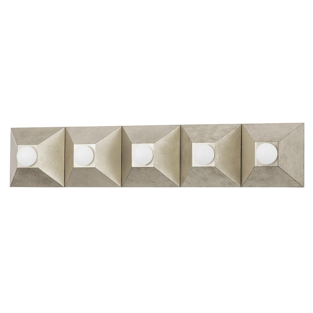 Playing with shapes, Max gives simple geometry maximum style. A series of pyramid bases supporting round globe lights come together to form squares and rectangles. The vintage gold or silver leaf finishes add to the design's overall Hollywood glam feeling. Whether in a flush mount, sconce or bath and vanity, Max adds a chic vibe to any space.