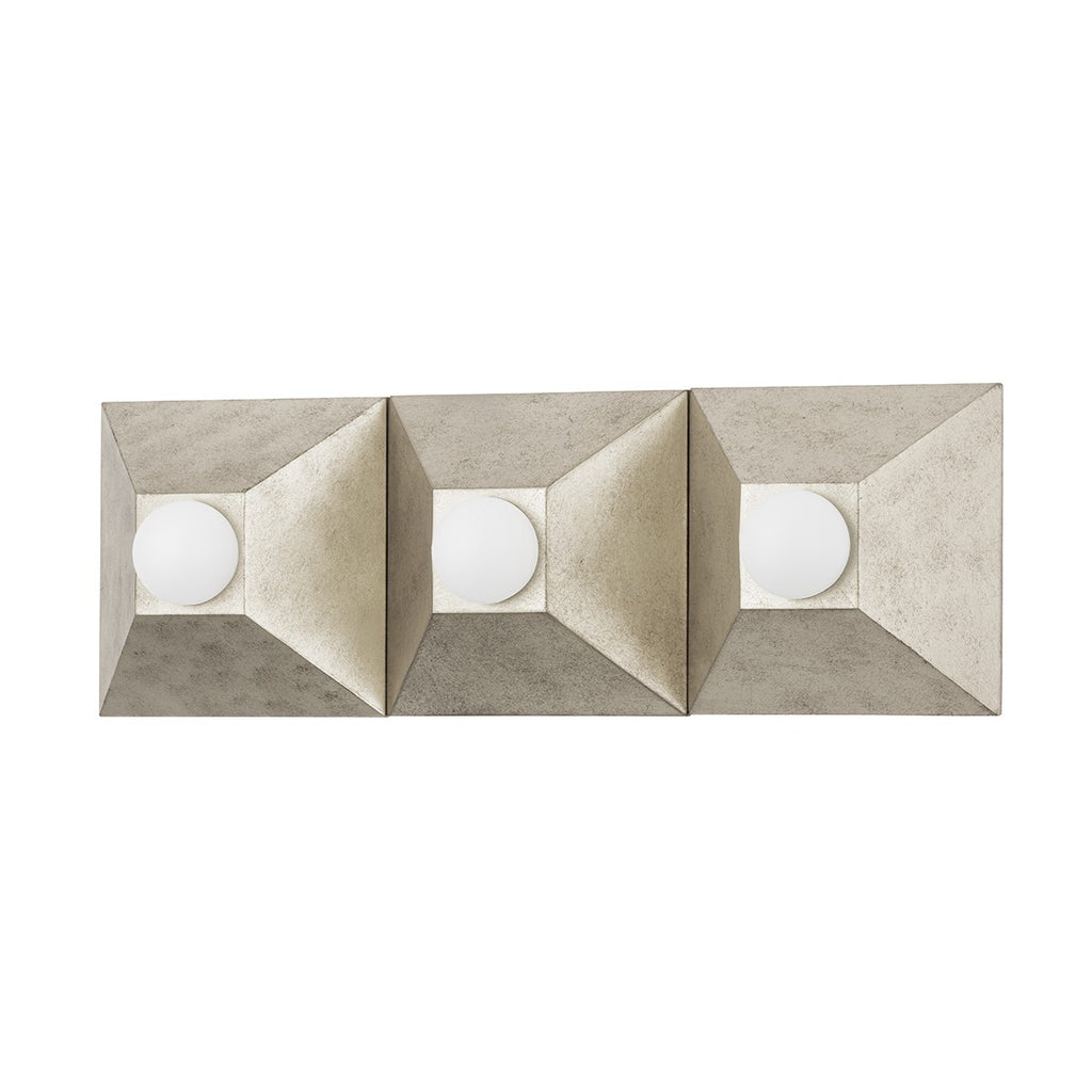 Playing with shapes, Max gives simple geometry maximum style. A series of pyramid bases supporting round globe lights come together to form squares and rectangles. The vintage gold or silver leaf finishes add to the design's overall Hollywood glam feeling. Whether in a flush mount, sconce or bath and vanity, Max adds a chic vibe to any space.