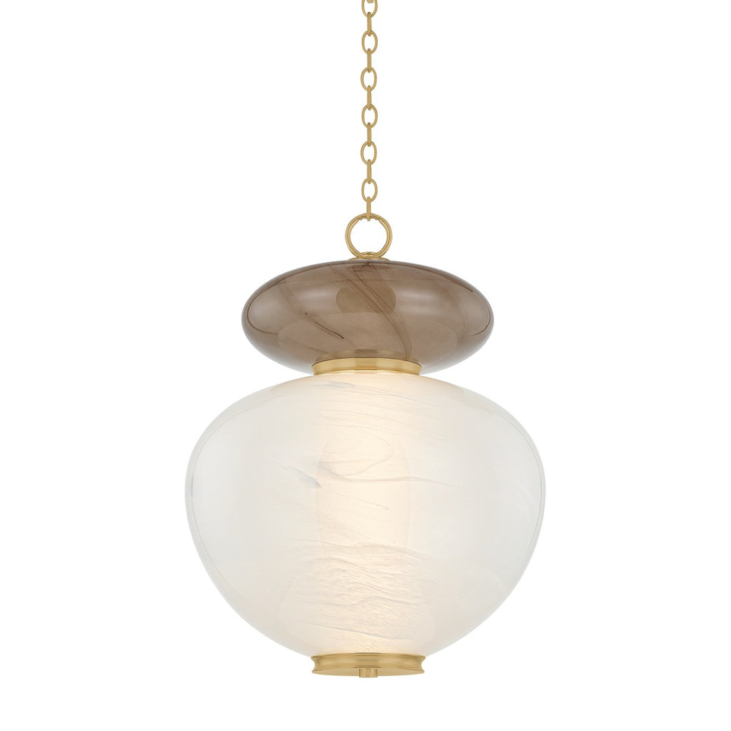 The organically-shaped Syros pendant is designed to be symmetric enough for use in multiples, while still feeling ornamental and elevated. It features a large Remolino Blanco glass shade topped by a smaller affogato glass shade. The sculptural stacked design is brought to life by the sense of movement in the specialty glass, accented by polished Vintage Brass metalwork. Available in two sizes.