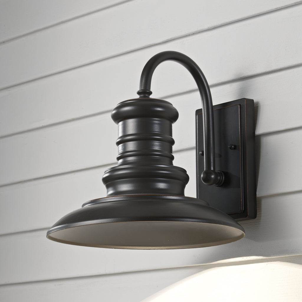 The Redding Station one light outdoor wall fixture in restoration bronze enhances the beauty of your property, makes your home safer and more secure, and increases the number of pleasurable hours you spend outdoors. All Aboard! Reminiscent of old railroad lighting, the Redding Station Collection warmly illuminates its surroundings with a vintage railroad vibe. The all-aluminum shades feature textured details. Redding Station is available in three finish options: Tarnished Silver, Restoration Bronze and Textured Black.