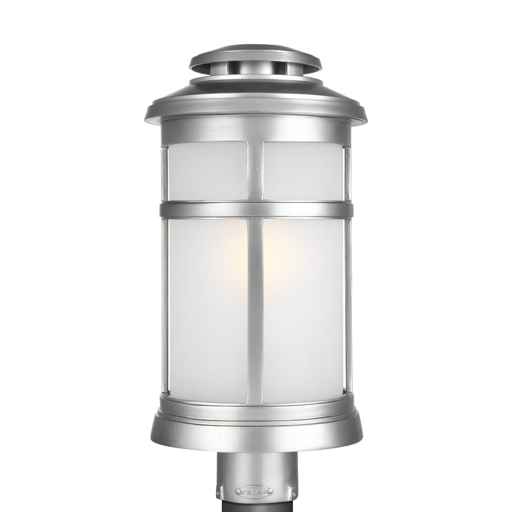 The Newport one light outdoor post top in painted brushed steel creates a warm and inviting welcome presentation for your home's exterior. The nautical-inspired Newport outdoor lighting is complete with lighthouse details including a vented top and a detailed cast frame surrounding an inner Opal Etched glass inner shade. Newport is available in either Painted Silver or Antique Bronze outdoor finishes and is made of StoneStrong - a unique synthetic composition that is made tough enough to withstand harsh environmental conditions, making it a great choice for Coastal applications.