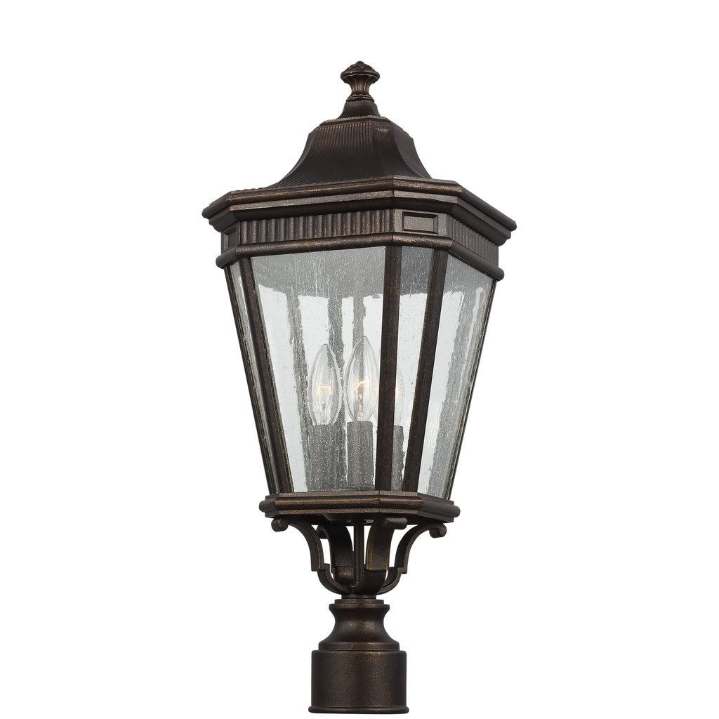 The traditional, antique gas lantern-inspired design of Cotswold Lane features dentil molding at the top of each pane of beveled glass. Cotswold Lane's profile is timeless and elegant. Available with two finish and glass options: a Black or Grecian Bronze frame with Clear Beveled glass or Clear Seeded glass panels.
