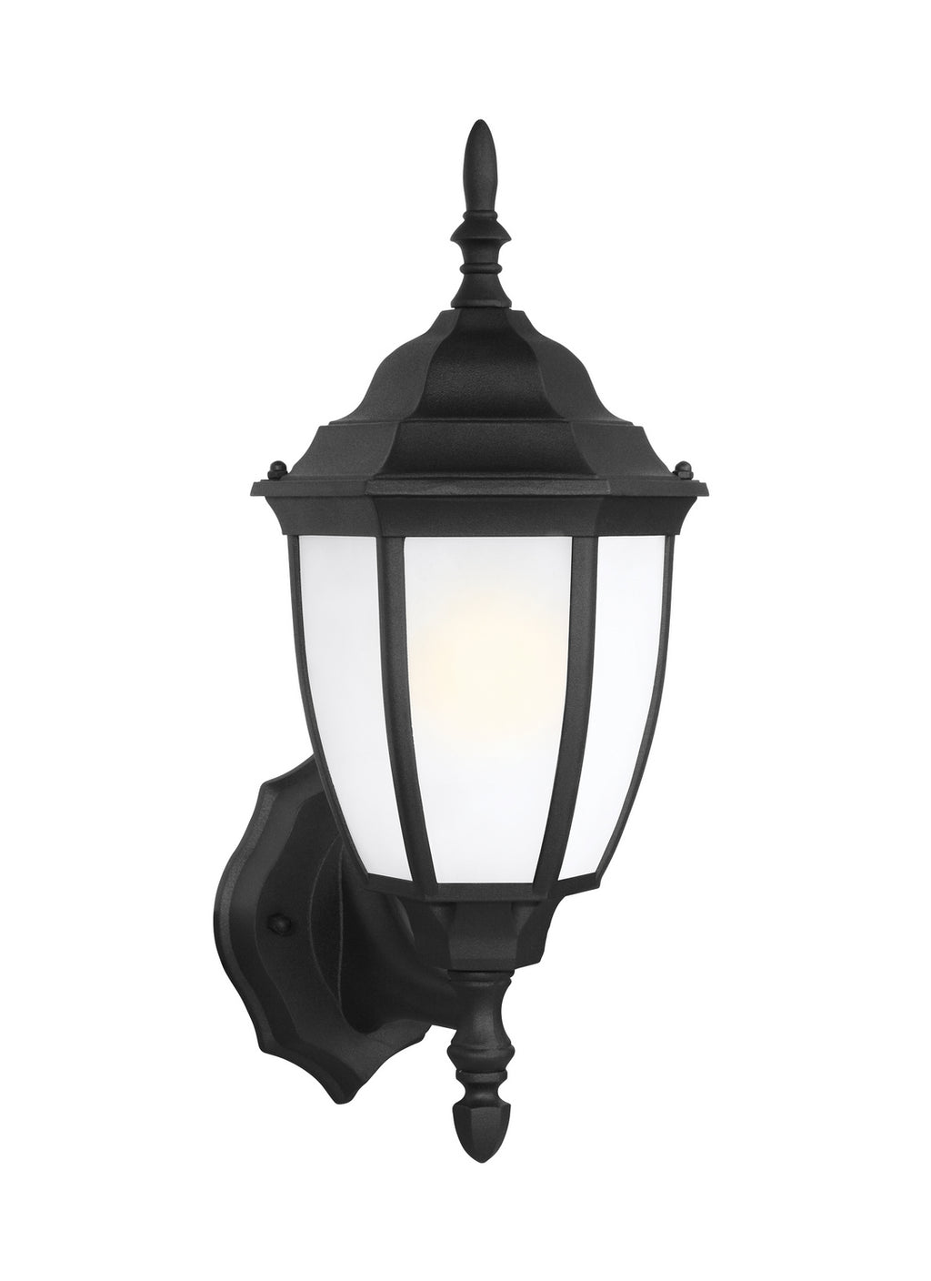 The Bakersville one light outdoor wall fixture in black creates a warm and inviting welcome presentation for your home's exterior. Bakersville outdoor lighting fixtures from are made to complement a wide range of architectural styles. Each light is crafted from high quality, durable steel and aluminum to provide you sensible style that lasts. The large, 1-light outdoor wall lantern is offered in Heirloom Bronze with Satin Etched glass or Clear Beveled glass. The remaining assortment of wall lanterns in three sizes and a Flush mount ceiling fixture are offered in a Black Powder coat finish with Satin Etched glass (with ENERGY-STAR-qualified LED lamping options) or Clear Beveled glass (which can easily convert to LED by purchasing LED replacement lamps sold separately).