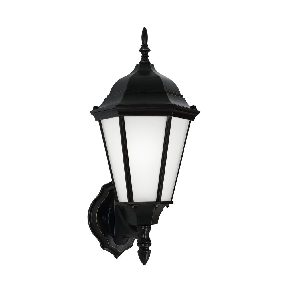 The Bakersville one light outdoor wall fixture in black creates a warm and inviting welcome presentation for your home's exterior. Bakersville outdoor lighting fixtures from are made to complement a wide range of architectural styles. Each light is crafted from high quality, durable steel and aluminum to provide you sensible style that lasts. The large, 1-light outdoor wall lantern is offered in Heirloom Bronze with Satin Etched glass or Clear Beveled glass. The remaining assortment of wall lanterns in three sizes and a Flush mount ceiling fixture are offered in a Black Powder coat finish with Satin Etched glass (with ENERGY-STAR-qualified LED lamping options) or Clear Beveled glass (which can easily convert to LED by purchasing LED replacement lamps sold separately).