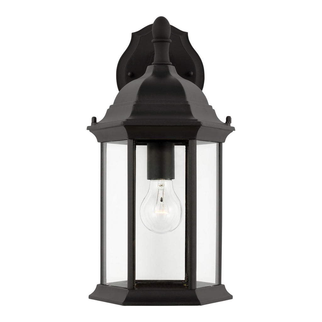 The Sevier one light outdoor wall fixture in black creates a warm and inviting welcome presentation for your home's exterior. The Sevier outdoor collection by brings timeless design to new heights with its traditional design details found in classic outdoor fixtures as well as an open bottom for easy maintenance. Made of durable cast aluminum, a multi-level crown, top finial and stepped-edge back plate complete the traditional look. Offered in Antique Bronze or Black finish, both with Clear glass, the collection includes a one-light outdoor pendant, one-light post lantern, a large one-light up light outdoor wall lantern, a small one-light up light outdoor wall lantern, a small one-light downlight outdoor wall lantern, and a large one-light downlight outdoor wall lantern.