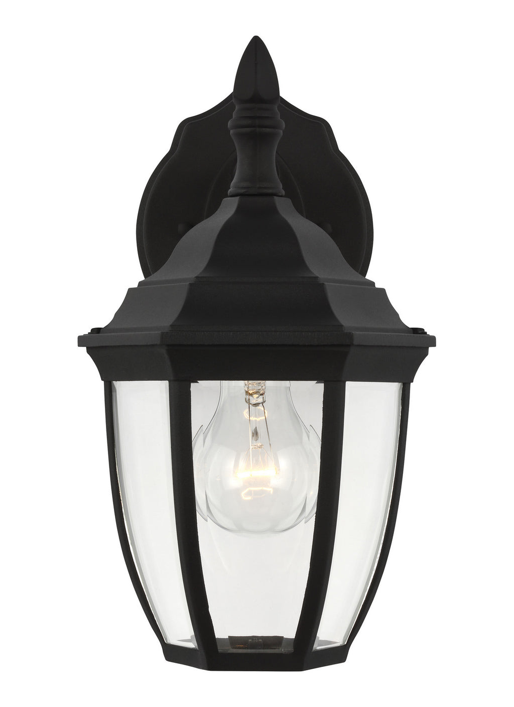 The Bakersville one light outdoor wall fixture in black creates a warm and inviting welcome presentation for your home's exterior. Bakersville outdoor lighting fixtures from are made to complement a wide range of architectural styles. Each light is crafted from high quality, durable steel and aluminum to provide you sensible style that lasts. The large, 1-light outdoor wall lantern is offered in Heirloom Bronze with Satin Etched glass or Clear Beveled glass. The remaining assortment of wall lanterns in three sizes and a Flush mount ceiling fixture are offered in a Black Powder coat finish with Satin Etched glass (with ENERGY-STAR-qualified LED lamping options) or Clear Beveled glass (which can easily convert to LED by purchasing LED replacement lamps sold separately).