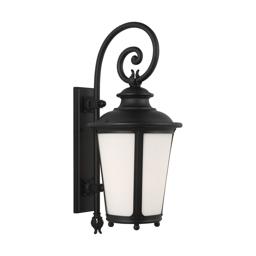 The Cape May one light outdoor wall fixture in black enhances the beauty of your property, makes your home safer and more secure, and increases the number of pleasurable hours you spend outdoors. The Cape May outdoor lighting collection by is a regal, traditionally styled lantern collection. Design elements include leaf ornamentation on the back plate and finial arms as well as the beautiful combination of the Burled Iron finish and Etched Hammered glass with Light Amber Tint to offer a warm glow. The assortment includes a small one-light outdoor wall lantern (available in a Dark Sky version too), a medium one-light outdoor wall lantern, a large one-light outdoor wall lantern, an extra-large one-light outdoor wall lantern, a one-light outdoor post lantern, a one-light outdoor pendant and a one-light ceiling flush mount. Both incandescent and LED ENERGY STAR-qualified lamping available, and most of these fixtures easily convert to LED.