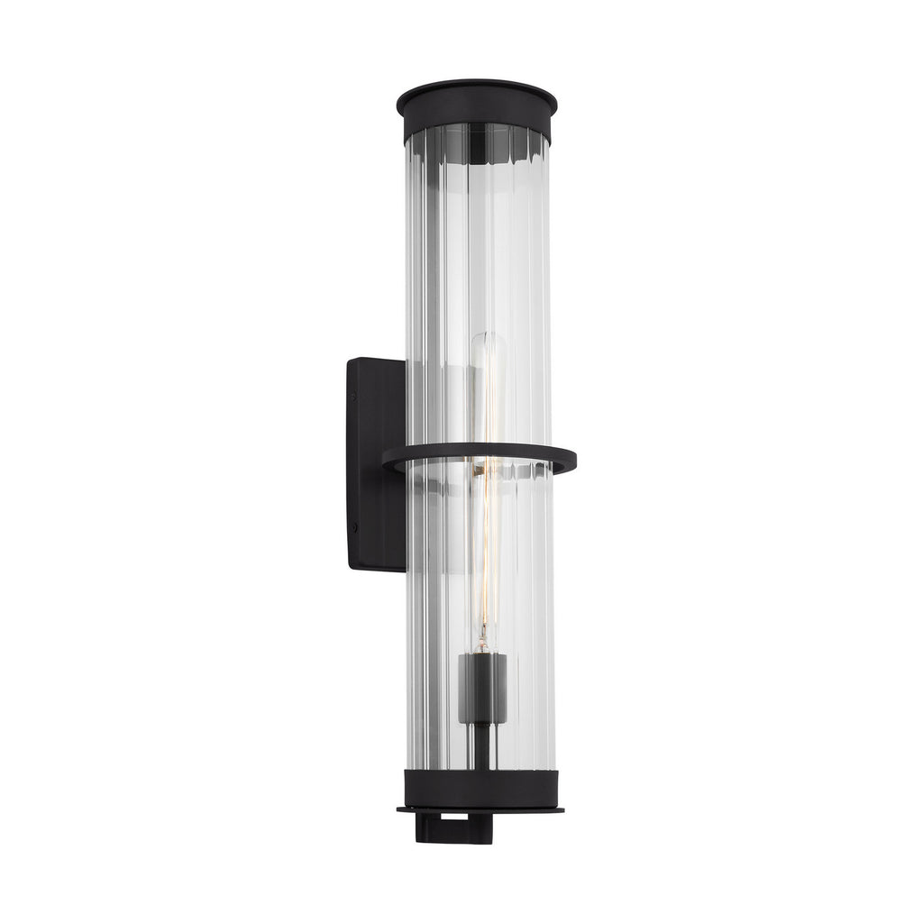 Clear fluted glass shades give the Alcona series a refined industrial look. The elegant square backplate and metal center ring provide a floating glass effect. The Alcona one light outdoor pendant fixture creates a warm and inviting welcome presentation for your home's exterior. Available in a handsome Black or Antique Bronze finish.