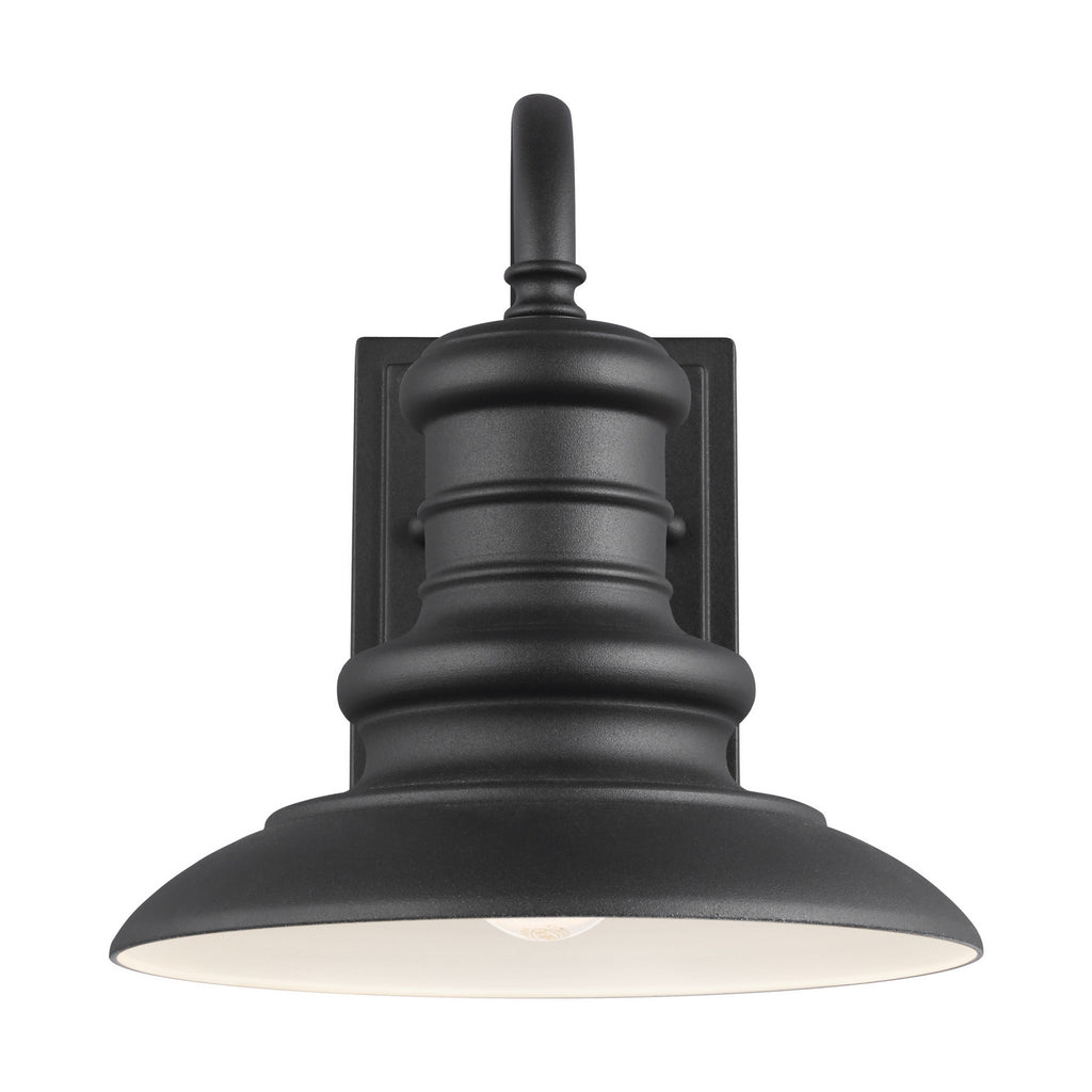 The Redding Station one light outdoor wall fixture in textured black creates a warm and inviting welcome presentation for your home's exterior. All Aboard! Reminiscent of old railroad lighting, the Redding Station Collection warmly illuminates its surroundings with a vintage railroad vibe. The all-aluminum shades feature textured details. Redding Station is available in three finish options: Tarnished Silver, Restoration Bronze and Textured Black.