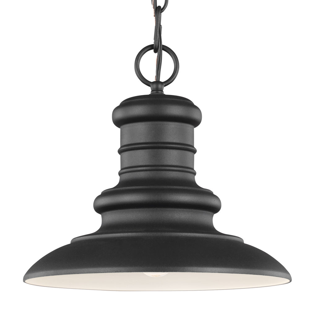 The Redding Station one light outdoor pendant fixture in textured black creates a warm and inviting welcome presentation for your home's exterior. All Aboard! Reminiscent of old railroad lighting, the Redding Station Collection warmly illuminates its surroundings with a vintage railroad vibe. The all-aluminum shades feature textured details. Redding Station is available in three finish options: Tarnished Silver, Restoration Bronze and Textured Black.