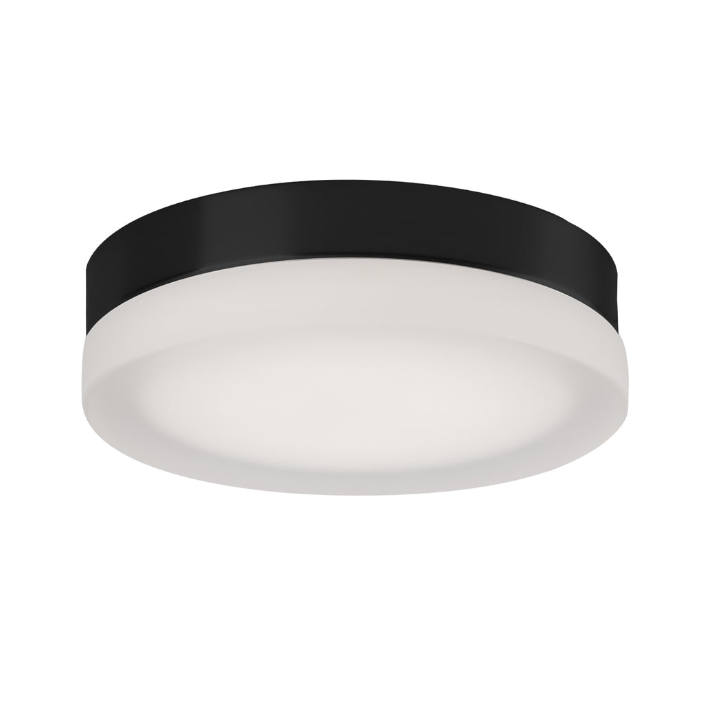 Single LED round flush mount ceiling fixture with two finishes. Round glass polished surface and painted white interior with chrome/vintage brass finish or round glass frosted and painted white interior with brushed nickel/black finish. Equipped with our powerful 120V AC LED technology.