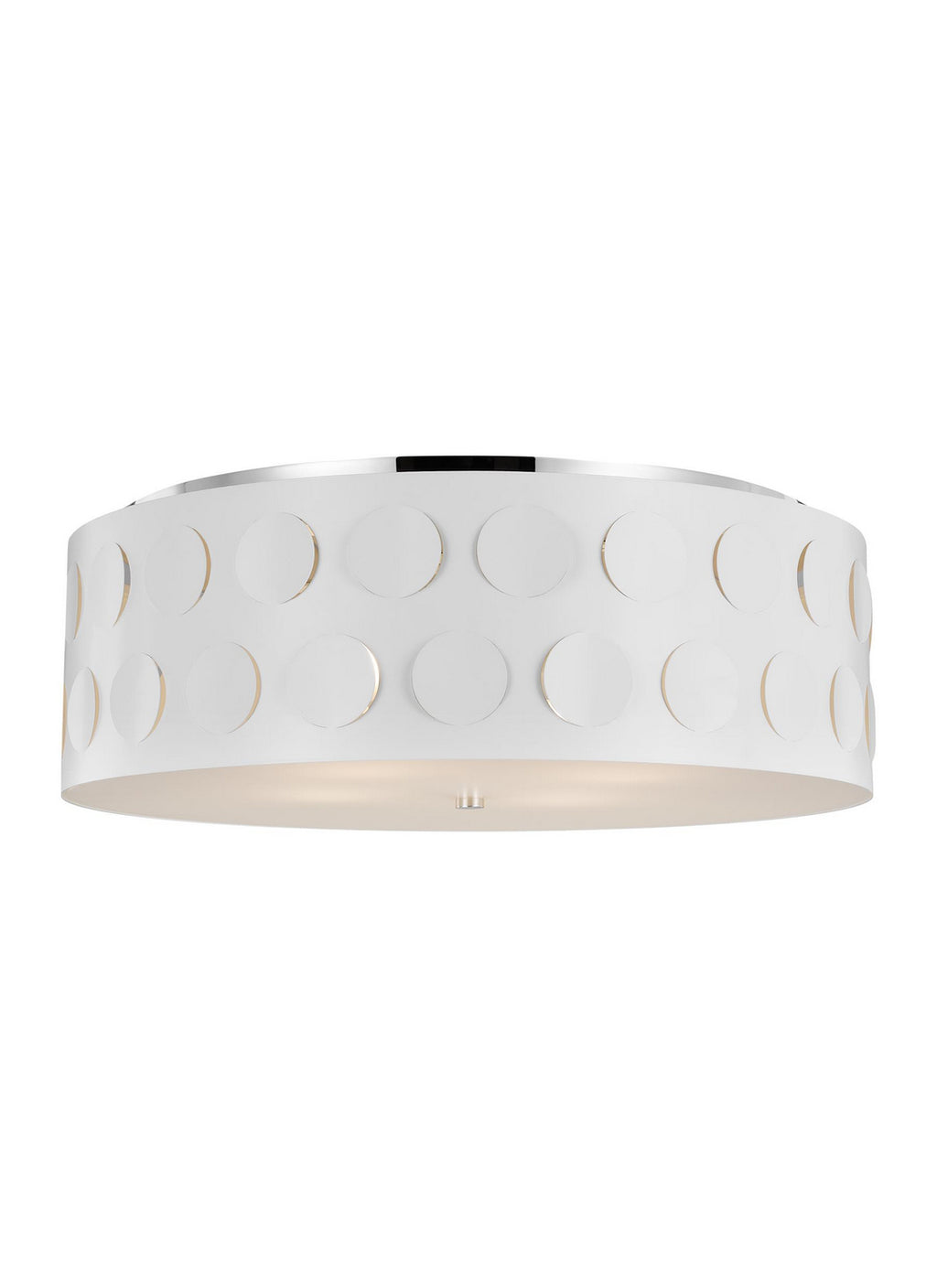 Dots are iconic to the kate spade brand—a simple and playful graphic motif. Dottie takes an iconic kate spade dot motif and cuts it into metal—creating a playful ambient light effect. A classic metal drum shade with an extra twist of perforated pattern. A matte white steel shade with an etched glass diffuser creates a gentle muted glow. Ideal for any hallway, foyer, bedroom, bathroom, or wherever overhead illumination is needed in transitional settings.