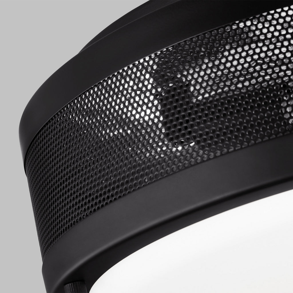 The Vander three light flush mount fixture in Midnight Black is a loft-style flush mount featuring a perforated metal exterior banded opal etched diffuser. Use it in a mudroom or laundry room for unfettered, functional light.