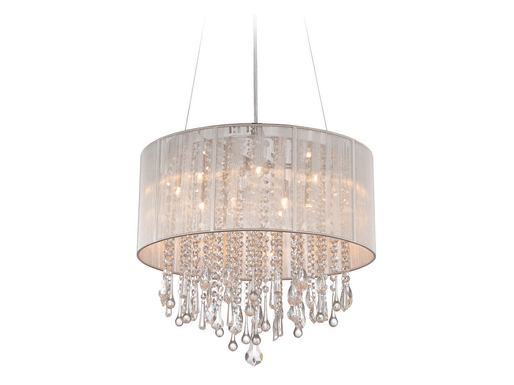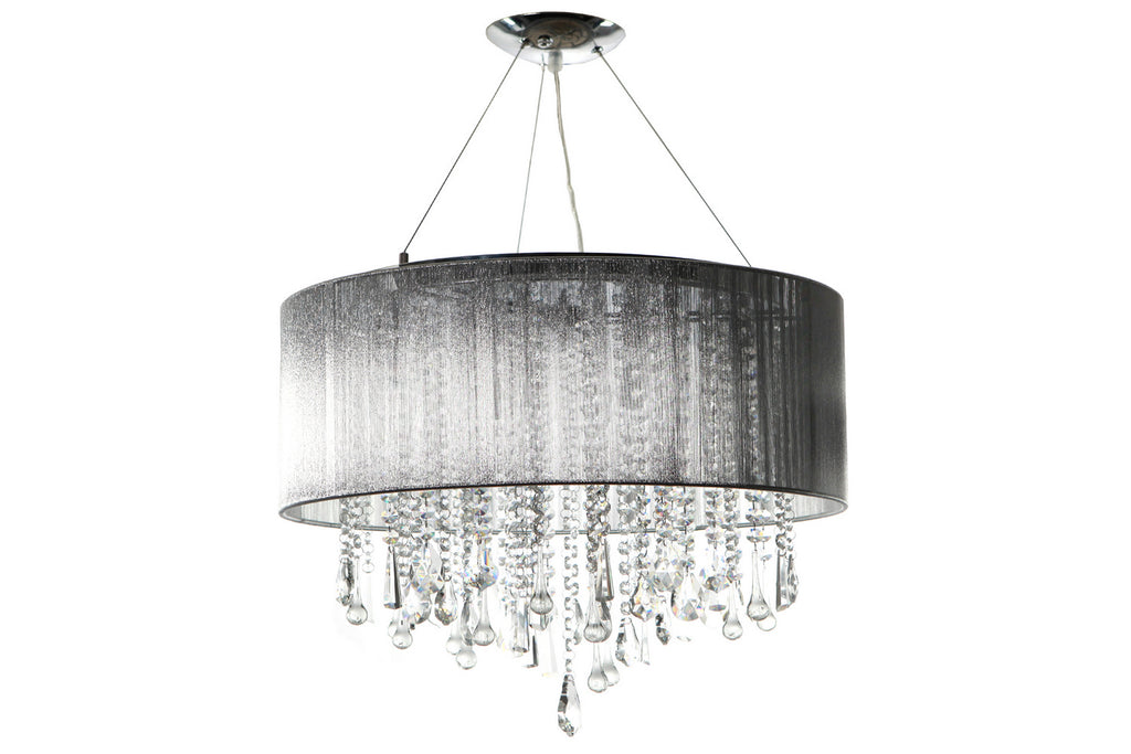 Bring a dramatic focal point to any area of your home with the unique round Beverly Dr. collection convertible ceiling mount's stunning style. Cut and polished crystals are held in place with stainless-steel rings and illuminated by brilliant halogen points of light and graced by a beautiful silk string shade.