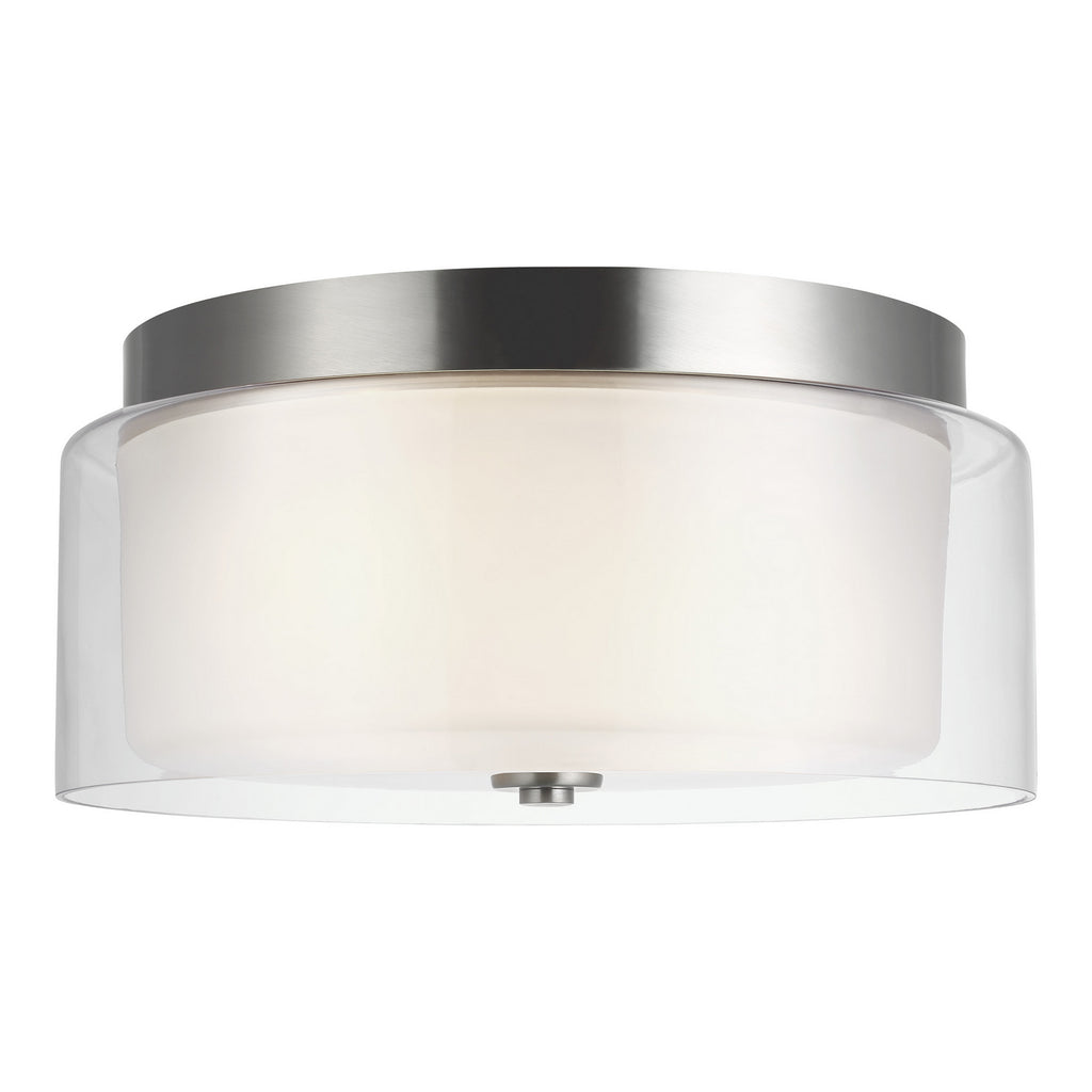 The Elmwood Park two light flush mount fixture in brushed nickel is an ENERGY STAR qualified lighting fixture that uses LED bulbs to save you both time and money. Elmwood Park by has clear glass tube shades with an inner white glass element that softens the light and helps cast an even glow. A cylinder of etched glass is centered within a larger cylinder of clear glass which encircles each light bulb to create this stunning visual effect. The full assortment includes three-, five-and nine-light chandeliers, a four-light linear, one-light mini pendant, a three-light pendant, a two-light semi flush which is convertible into a pendant, and one-, two-, three- and four-light bath fixtures. All fixtures offered in either a Brushed Nickel or Brushed Oil Rubbed Bronze. Incandescent and ENERGY STAR-qualified LED lamping are available, all fixtures are California Title 24 compliant.