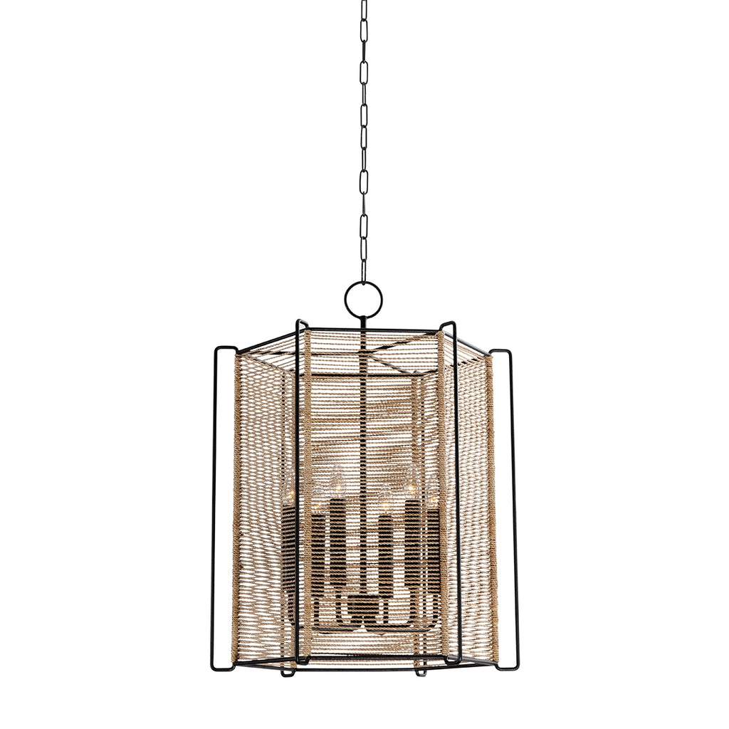 A textured black framework is wrapped in natural jute on the interior to create a modern industrial style that looks rustic yet elevated. The metal frame is vertical and the rope detail runs horizontal forming a dynamic silhouette that feels fresh. The lantern is available in three different sizes to suit any space.