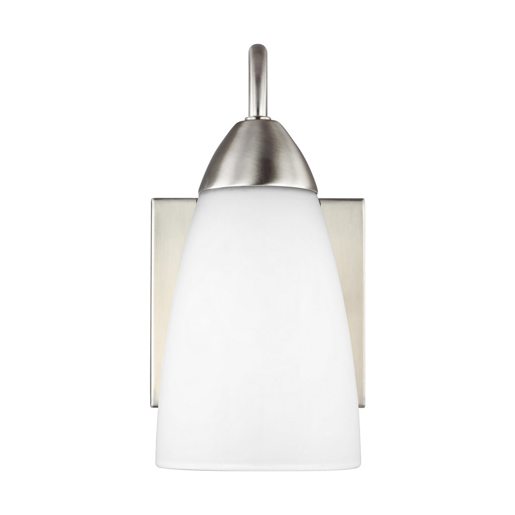 The Seville one light wall sconce in brushed nickel is an ENERGY STAR qualified lighting fixture that uses LED bulbs to save you both time and money. The Seville collection represents commitment to high style at a sharp price. The modernist design is epitomized by the teardrop curves in the arms tipped by Etched glass diffusors throughout the chandeliers and bath fixtures. The collection offers a "whole home" lighting solution in every imaginable category. The assortment includes nine-light, five-light, and three-light chandeliers (either with up-light or down-light), pendants in four sizes as well as one-light, two-light, three-light , four-light and five-light wall/bath fixtures. Install a stylish and elegant addition to any room in the house. Seville is offered in Brushed Nickel and Burnt Sienna finishes.