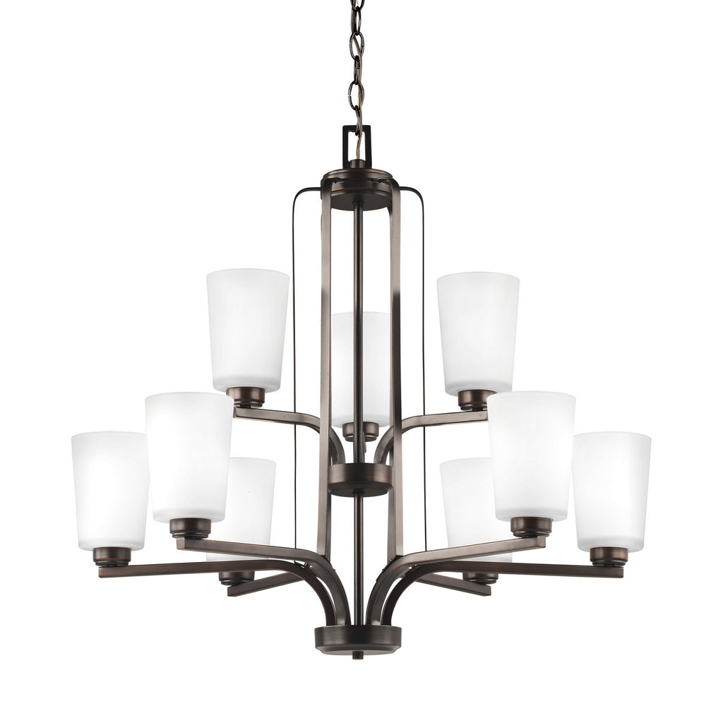The Franport nine light multi-tier chandelier in bronze is an ENERGY STAR qualified lighting fixture that uses LED bulbs to save you both time and money. Modernist influences abound in the Franport Collection. Shades with sharp lines and simplified bases showcase the minimalist approach with a twist. Franport has fixtures for all parts of the property. Available in both Burnt Sienna and Brushed Nickel finish choices as well as Nickel for bath fixtures. With fixtures in various sizes and configurations, the Franport Collection will coordinate the same design theme across several different rooms. Its assortment includes three-, five-, nine- and fifteen-light chandeliers, and one- two-, three- and four- light bath vanity fixtures. The Franport collection pars wonderfully with Geary ceiling fixtures. Incandescent and ENERGY STAR-qualified LED lamping are available, all fixtures are California Title 24 compliant.