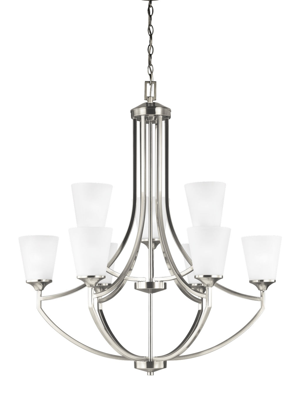 The Hanford nine light multi-tier chandelier in brushed nickel enhances the beauty of your home with ample light and style to match today's trends. The transitional styling of the Hanford lighting collection by is evident in its elegant symmetry articulated by long, sweeping arms. Tapered Etched glass shades produce a soft uplight and make Hanford complementary to a wide array of decor from traditional to contemporary. Offered in both Brushed Nickel and Burnt Sienna finishes, the collection includes five-, nine- and fifteen-light chandeliers, a three-light hall/foyer light, a one-light mini pendant, a three-light pendant, a three-light semi-flush mount which can convert into a pendant, and one-, two-, three- and four-light bath fixtures. Incandescent and ENERGY STAR-qualified LED lamping are available, all fixtures are California Title 24 compliant.