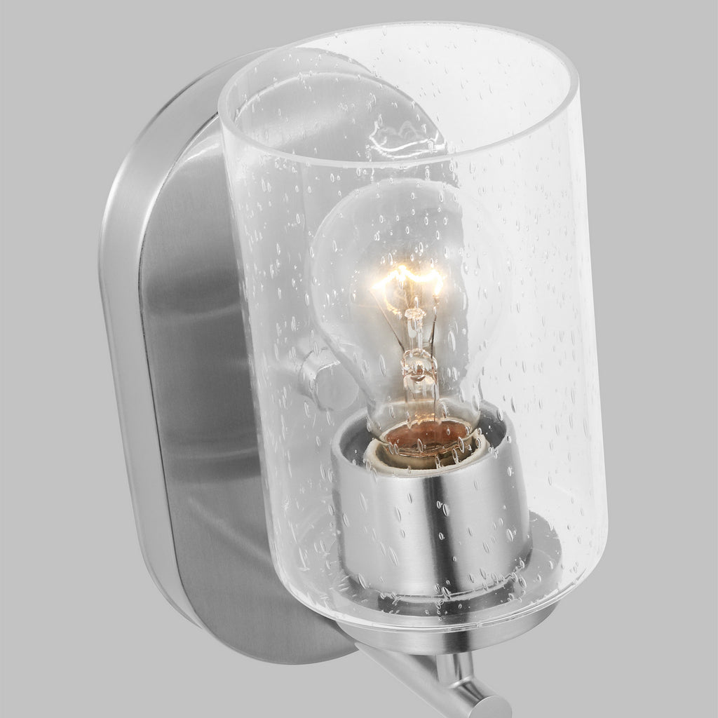 The Oslo one light wall sconce in Brushed Nickel offers shadow-free lighting in your powder room, spa, or master bath room. The Oslo lighting collection by is a sleek design, with smooth and clean lines. The Clear Seeded glass adds to this collection's contemporary and minimalist character. Offered in Chrome, Brushed Nickel, Bronze and Midnight Black finishes, the collection includes nine-, five-, and three-light chandeliers, mini pendant, both flush and semi-flush ceiling fixtures, as well as one-, two-, three- and four-light wall/bath fixtures. Both incandescent lamping and ENERGY STAR-qualified LED lamping are available. All fixtures are California Title 24 compliant.