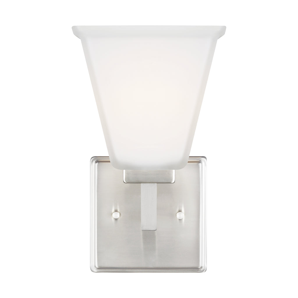 The Ellis Harper one light wall sconce in brushed nickel is an ENERGY STAR qualified lighting fixture that uses LED bulbs to save you both time and money. Ellis Harper has an Arts and Crafts pedigree with a Modernist twist. The array of fixtures showcases the commitment to high style with robust construction and craftsmanship at an exceptional price. The subtle detail allows this transitional design to easily fit into any decor. The sleek, geometric arms and square Satin Etched glass shades add touches of elegance to its streamlined profile. The assortment includes: four- and eight-light chandeliers, a six-light linear, one-light mini-pendant, and one-, two-, three- and four-light bath fixtures. All fixtures are offered in either a Brushed Nickel or Brushed Oil Rubbed Bronze.