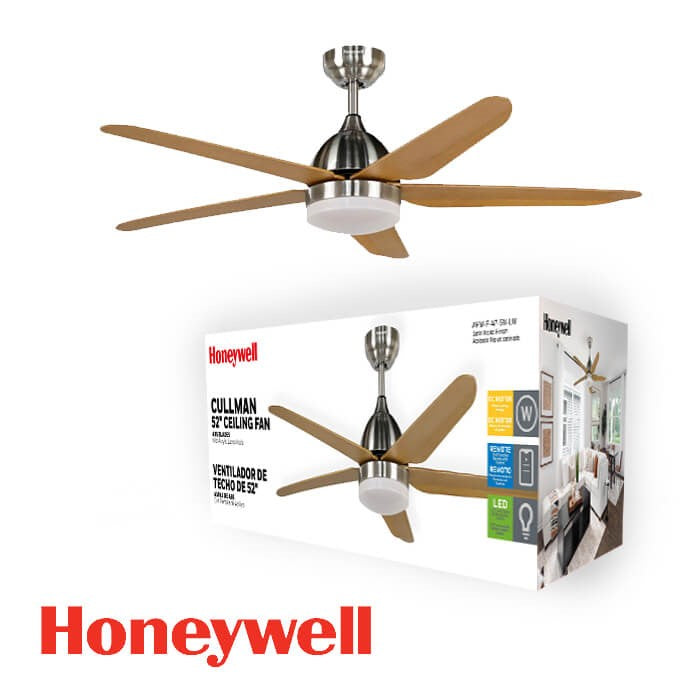 Ajuste de tonalidad cct:30k,40k,60k,Pantalla acrílica,5 Aspas abs, 6 Velocidades, Motor dc, Material satin nickel metal ,Dimensiones:153*12MM, CFM: 5611 RPM :250 certificación CE,Marca Honeywell
