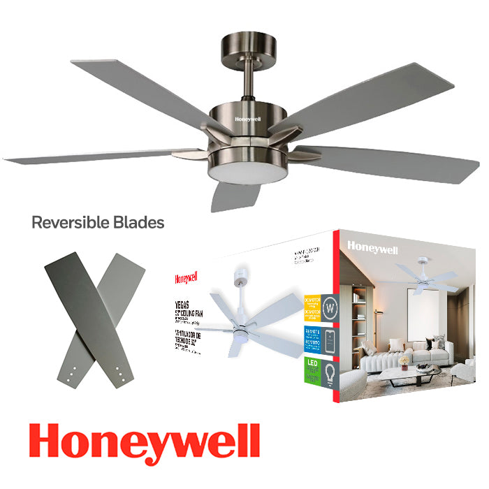 Ajuste de tonalidad cct:30k, 40k, 60k , 110-240V 50-60HZ con grado de protección IP20 , Motor dc 40w, Dimensiones156MM** 10MM5, Aspas de madera, Pantalla de acrílico, 6 velocidades, Material metal, CFM: 5929 RPM:200, certificación CE, Marca Honeywell
