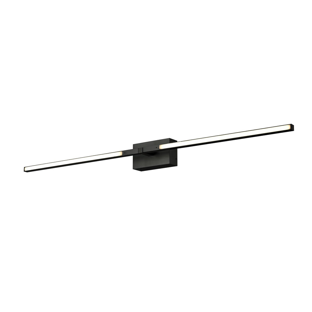 Dual square profile linear aluminum arms with rectangular wall mount. Inset opal polymeric diffusers. Finely textured plate or powder-coated finish. Wall emitting lights with rotational adjustment.