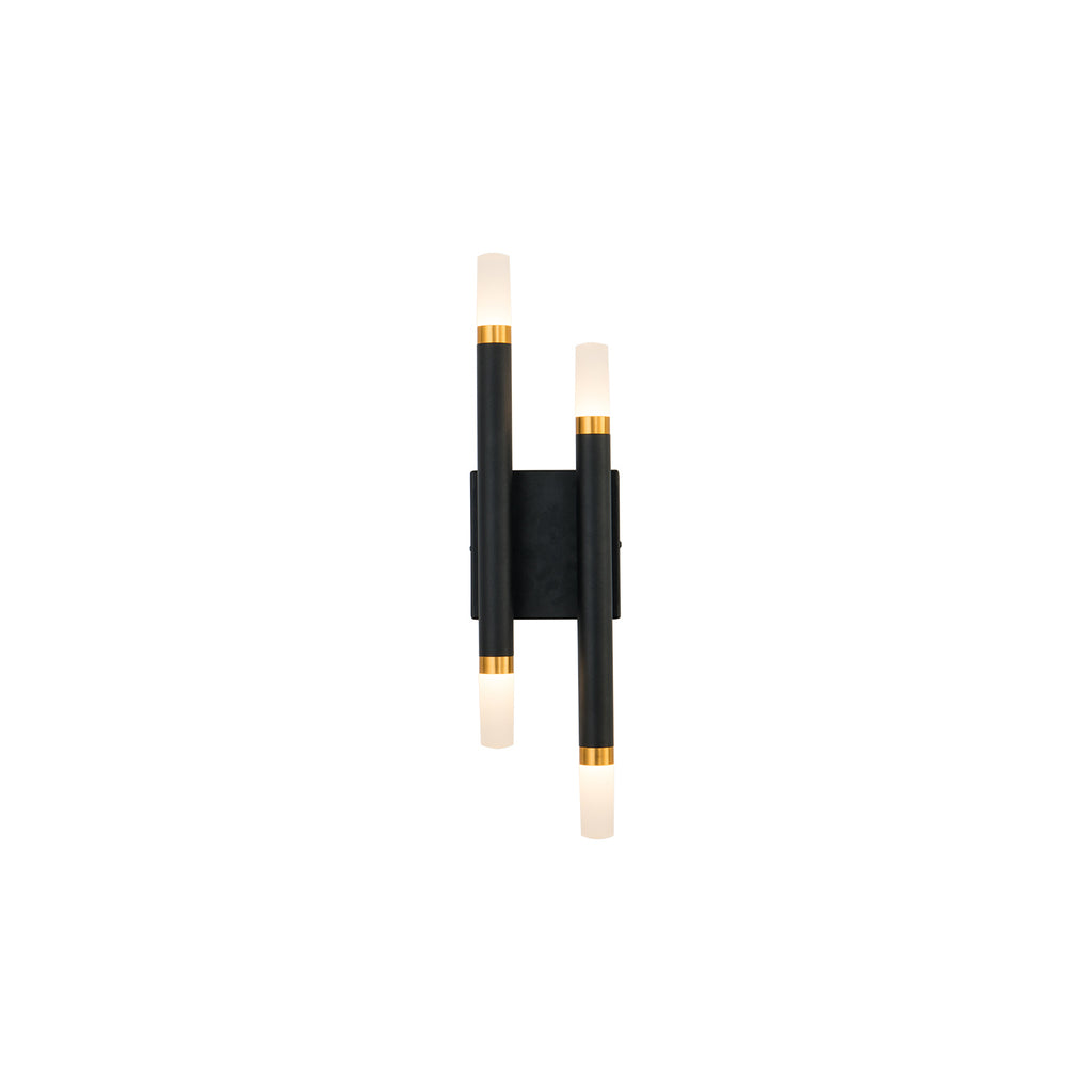 Cylindrical aluminum arms extend from square wall mount. Finely textured powder-coat finish. Tapered round translucent diffusers. Plated-brushed gold accent rings. Up and down light. Custom options available.