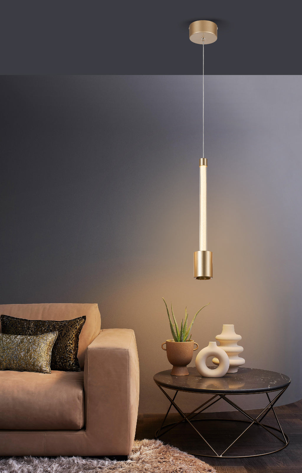 LÁMPARA DE TECHO COLGANTE DECORATIVA MODERNA LED 7W, TONALIDAD DE 3000K, 100-240V, 50-60HZ, GRADO DE PROTECCION IP20, ACABADO DORADO + ACRILICO + DIE CAST ALUMINUM, DIMENSIONES: D-8.5CM H-37+150CM, MARCA HOME DELIGHT.