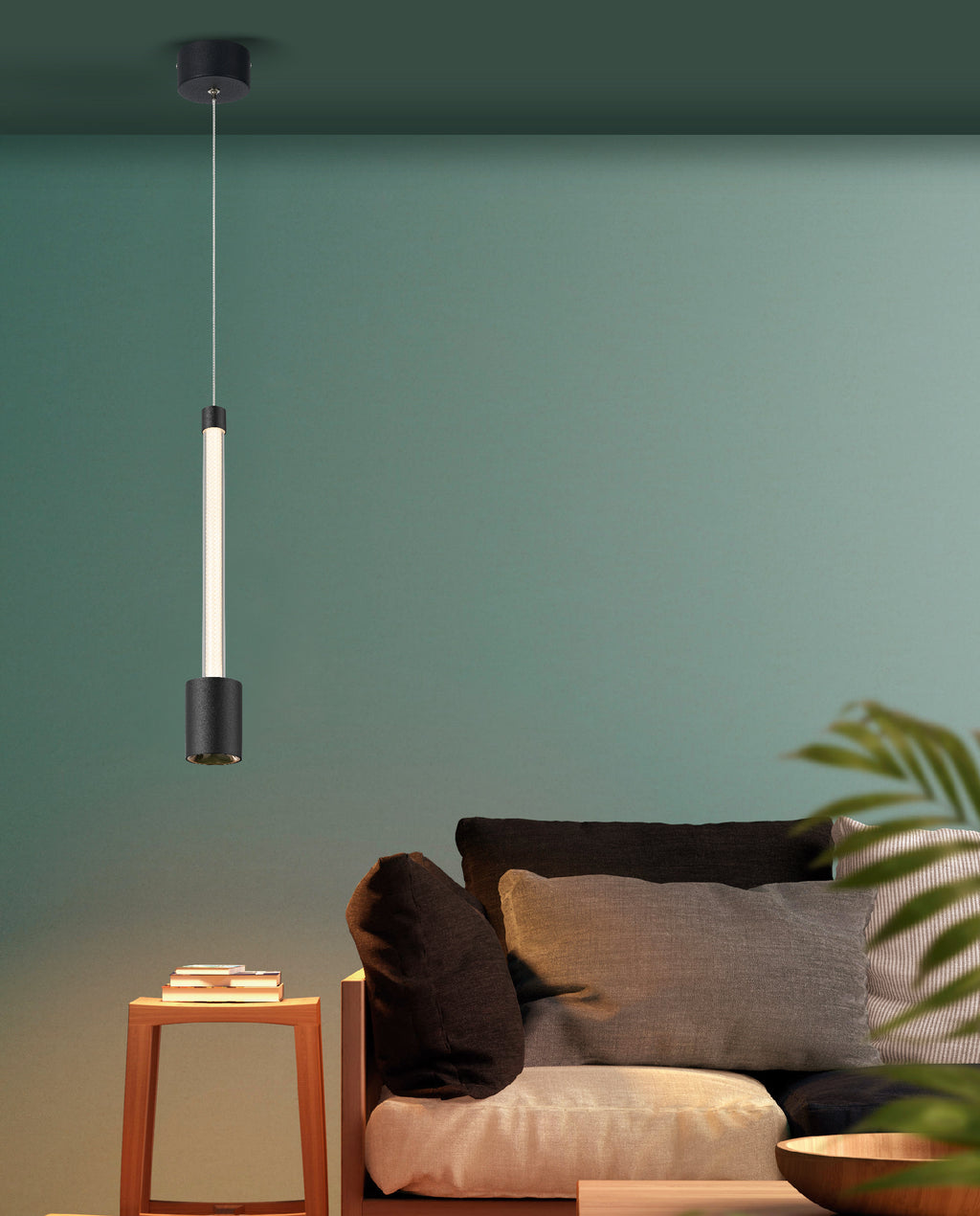 LÁMPARA DE TECHO COLGANTE DECORATIVA MODERNA LED 7W, TONALIDAD DE 3000K, 100-240V, 50-60HZ, GRADO DE PROTECCION IP20, ACABADO NEGRO + ACRILICO + DIE CAST ALUMINUM, DIMENSIONES: D-8.5CM H-37+150CM, MARCA HOME DELIGHT.