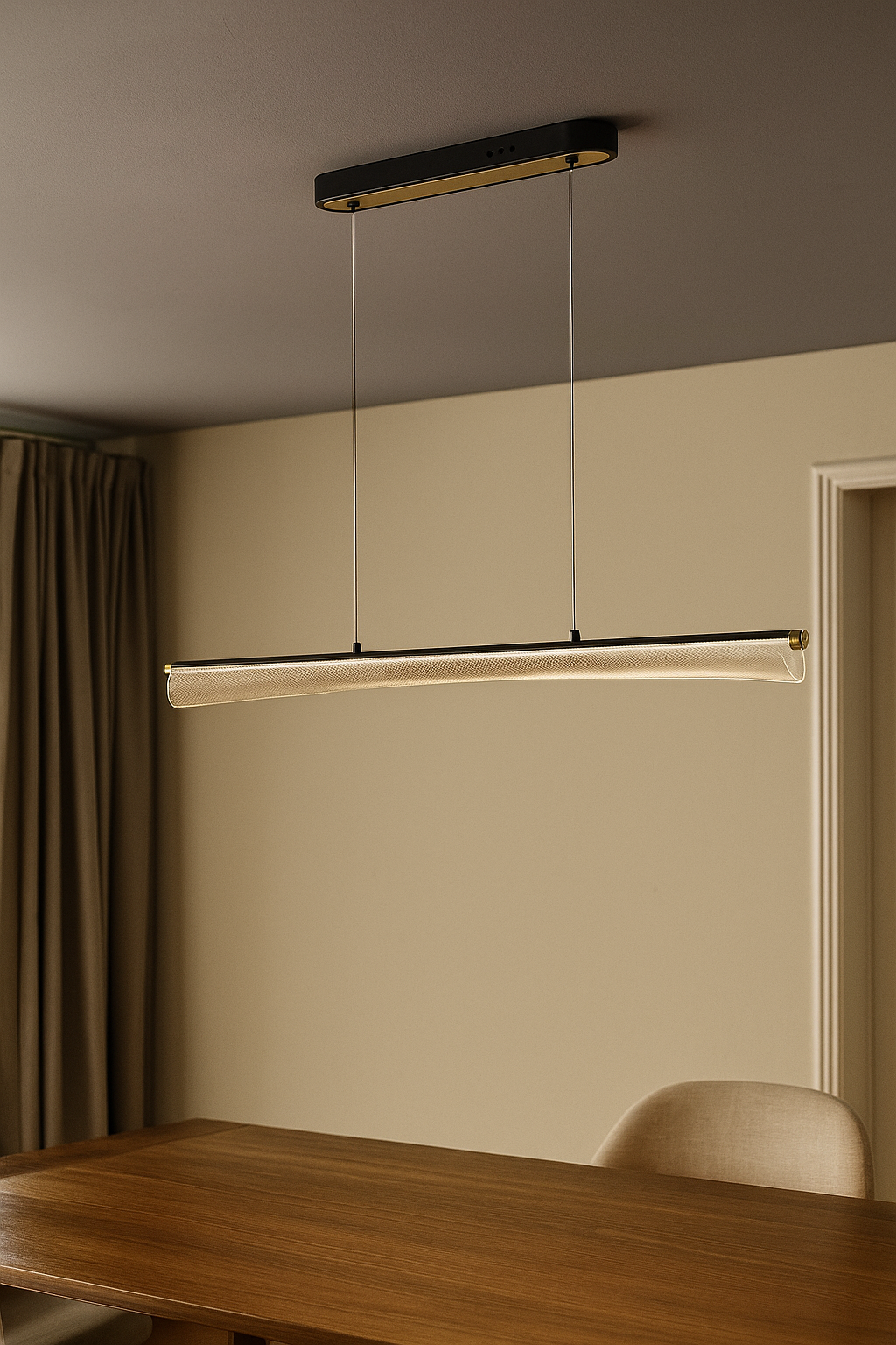 LÁMPARA DE TECHO DECORATIVA LED 37W, TONALIDAD 3000K, 110-240V, 50-60HZ, GRADO DE PROTECCION IP20, ACABADO NEGRO + DORADO + MATERIAL METAL + ACRLICO, DIMENSIONES:L-121CM H-120CM, MARCA HOME DELIGHT.
