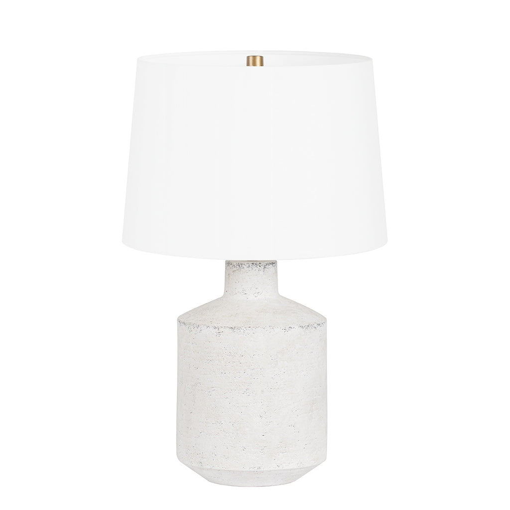 This sleek, subtle lamp is a natural, neutral way to add an organic modern style to any tabletop. Light shines down from the white linen drum shade highlighting the texture and natural color variations in the weathered finish of the artifact white ceramic base.