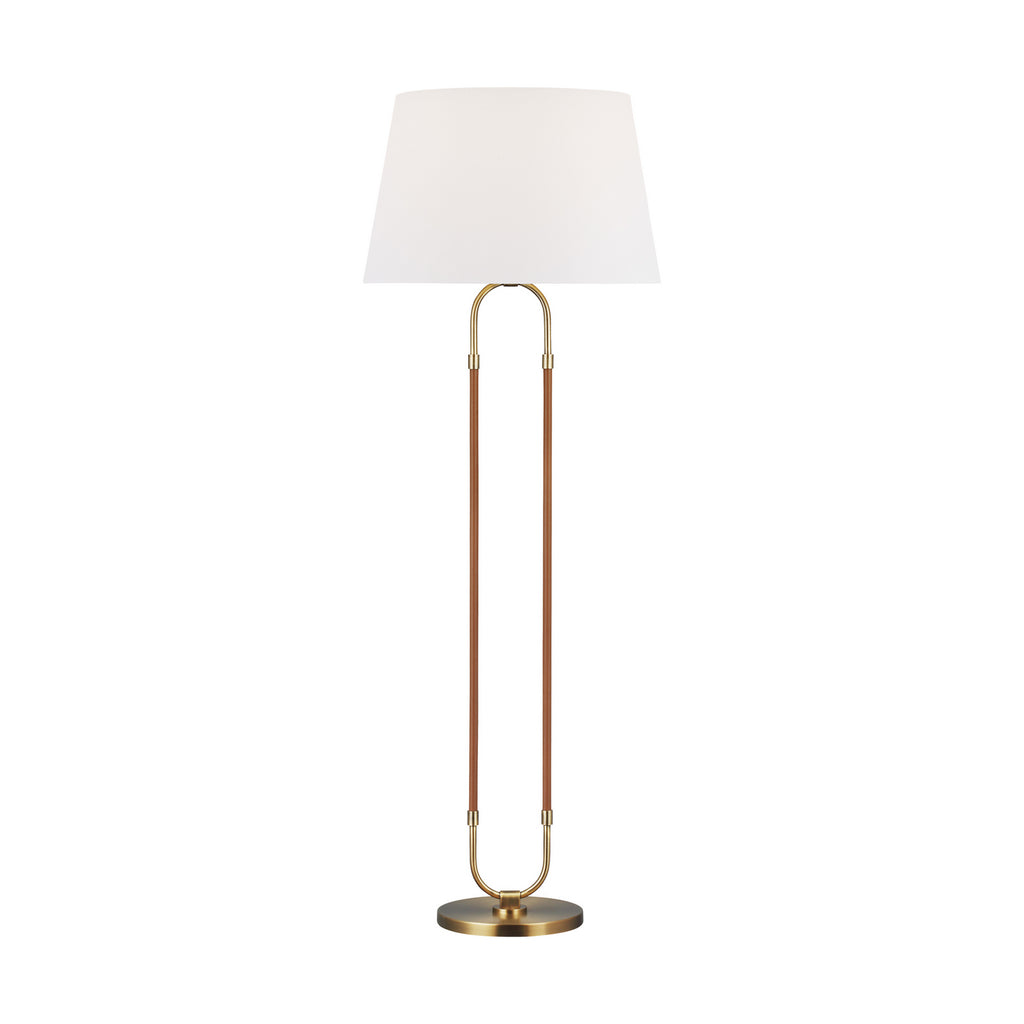 In the Katie one light floor lamp leather straps contrast with metal and white linen fabric shade to round out a timeless design. Available in: Time Worn Brass with Brown Leather or Polished Nickel with Black Leather. The combination of leather and steel gives this round chandelier equestrian flair.