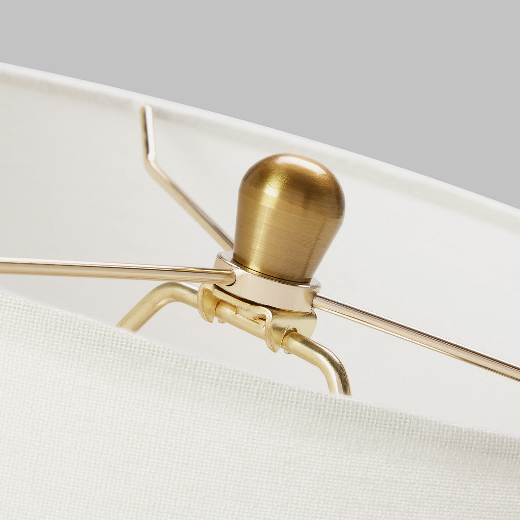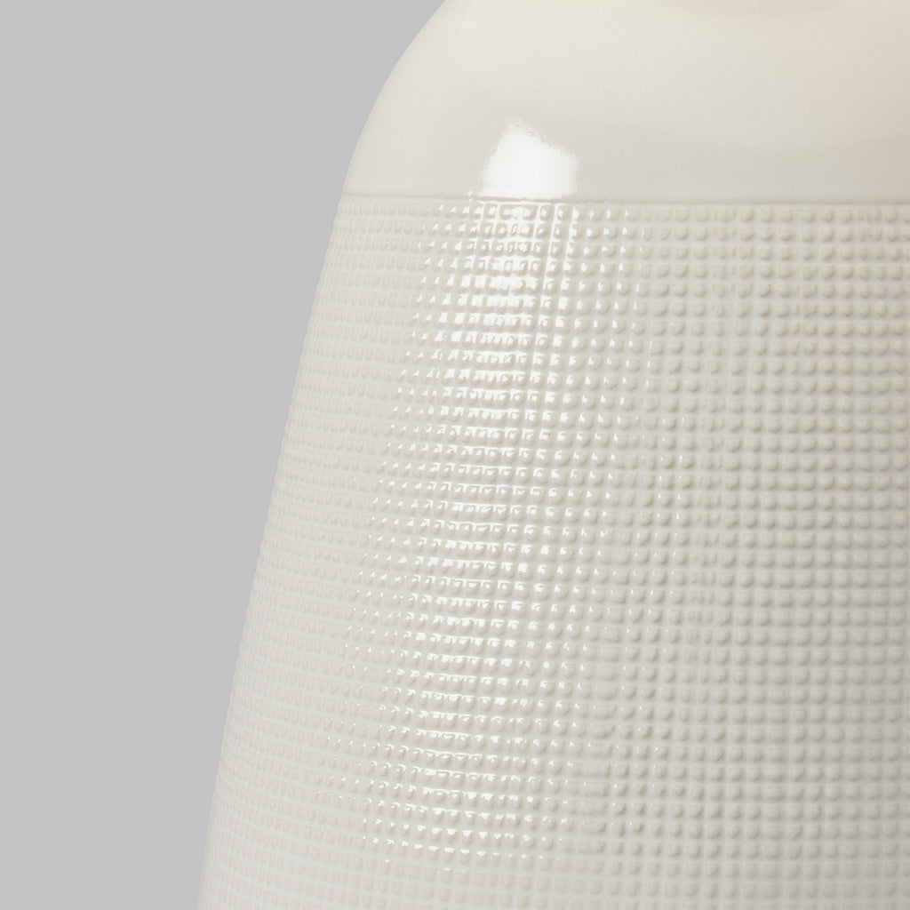 The Ornella tall table lamp by AERIN for Visual Comfort Studio has been styled in a classic elongated shape enhanced with imprinted net detailing, offering an artistic interplay between smooth and textured surfaces. The lamp is further enhanced with a perfectly proportioned linen shade, which casts soft illumination.