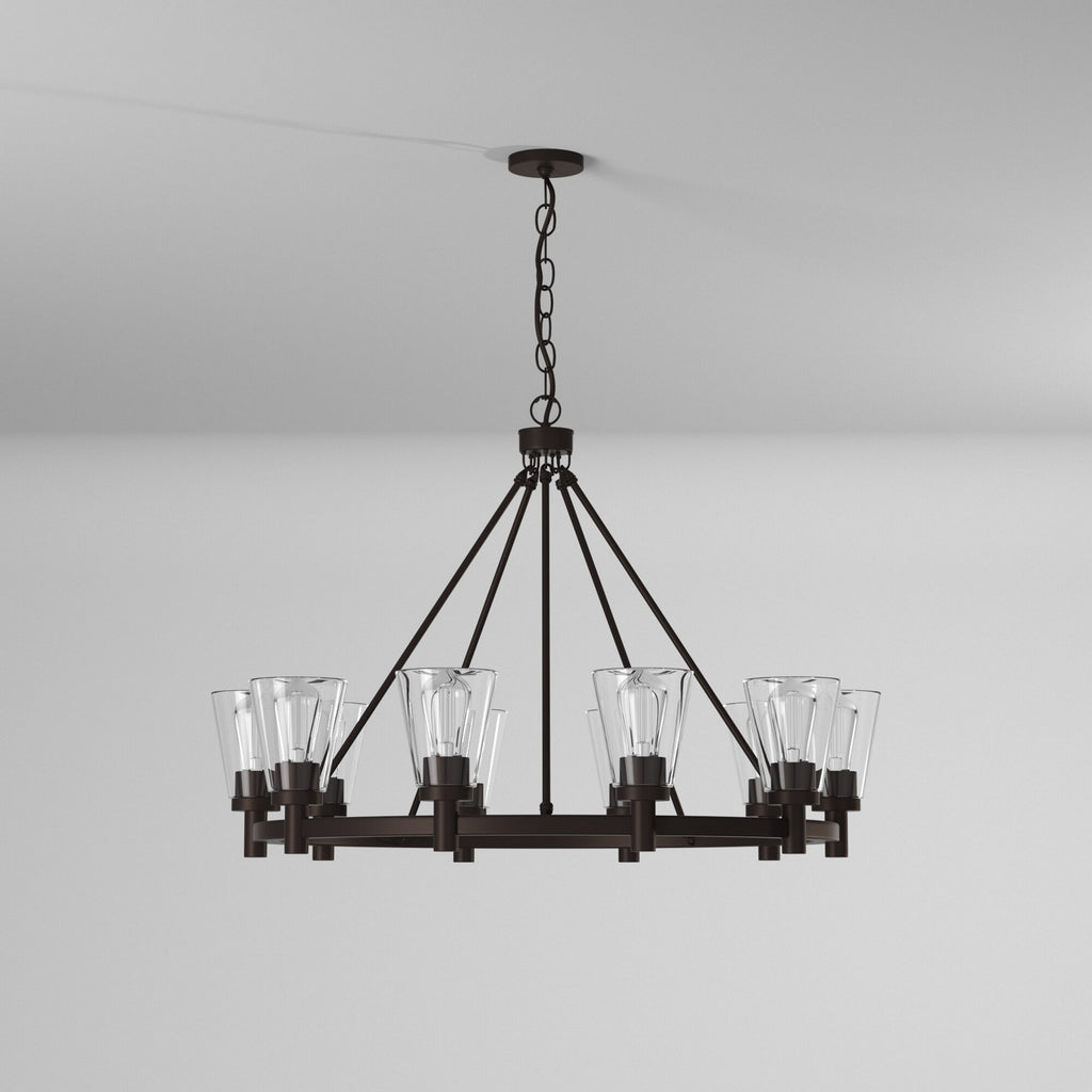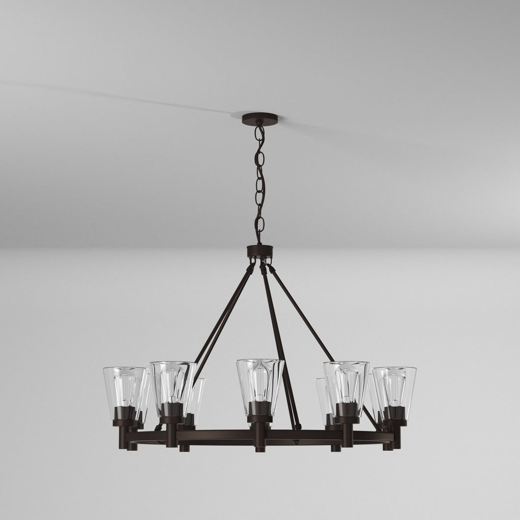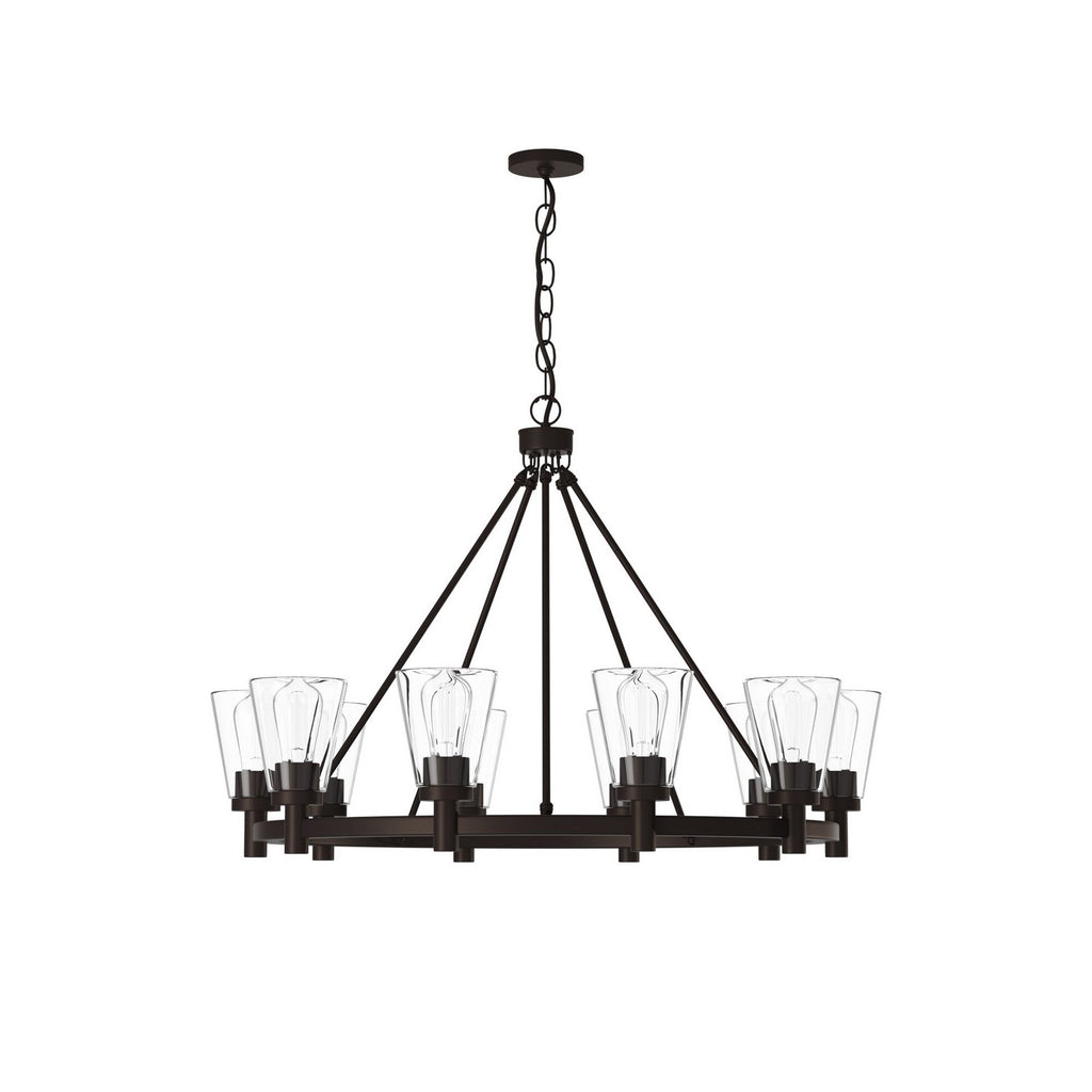 The "Clarence" collection is comprised of a rich oil rubbed bronze finish that ties up with clear cone shaped glassware. Shown with retro type Edison bulbs for maximum aesthetic beauty. Also available in a plated brushed nickel version. Single tier ten light model shown.